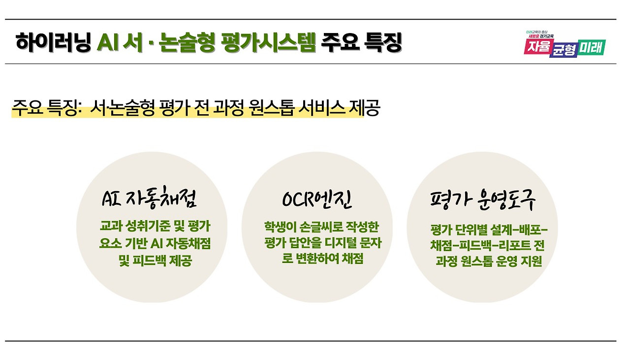 경기교육이 개발한 시스템은‘AI 기반 서·논술형 평가’이다. 이 평가는 경기교육의 온라인 학습 플랫폼인 ‘하이러닝’을 통해 활용된다. 2025년 7월부터 새롭게 적용된 교육과정과 연계하여, 현재 중학교 1학년과 고등학교 1학년을 대상으로 시범 운영을 시작했다.