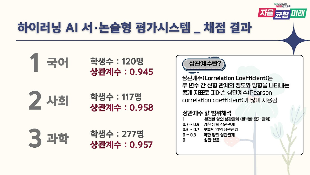 시스템 구축 과정에서 가장 중요하게 다룬 부분은 ‘AI의 채점이 실제 교사 채점과 얼마나 일치하는가’였다.. 그래서 시스템 도입 전까지 시범운영연구회를 운영하며 검증을 반복했다. 결과는 매우 긍정적이었다. AI 채점 결과와 교사 채점 결과의 상관계수는 모두 0.9 이상을 기록했다. 이는 ‘AI가 교사 수준의 판단을 재현할 수 있다’라는 가능성을 입증한 것이다.