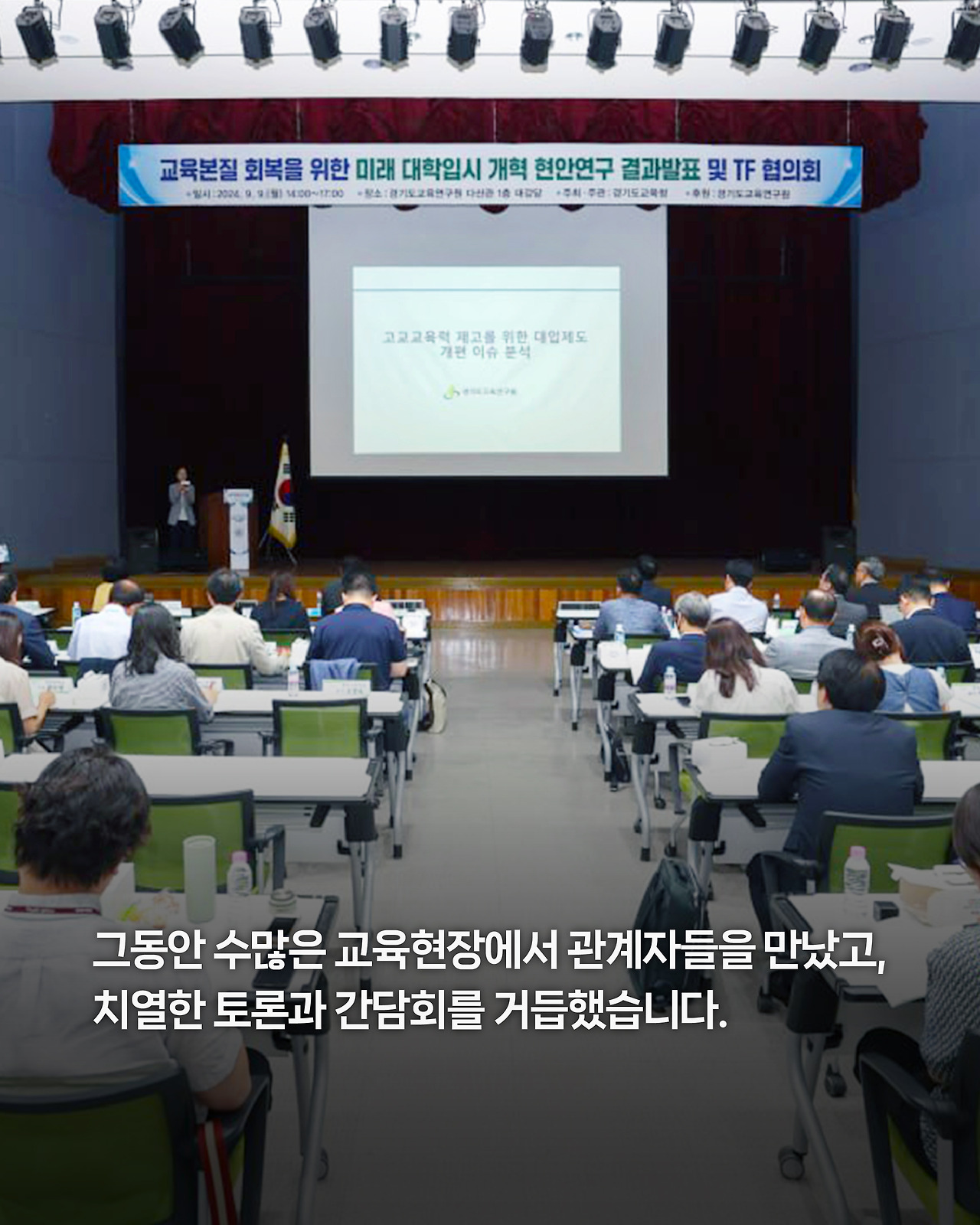 경기교육은 이러한 문제의식을 바탕으로 대입 개혁의 핵심 과제인 ‘공정한 평가 체제’ 구축을 위해 노력해 왔다. 대학의 상황과 교육 현장의 요구를 충분히 반영하고, 평가 방식과 평가 항목 등을 신뢰할 수 있도록 하고자 했다.