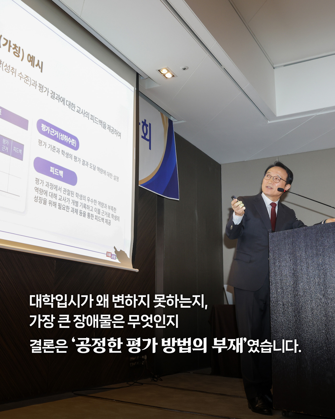 그동안 수많은 교육현장에서 관계자들을 만났고, 치열한 토론과 간담회를 거듭했다. 대학입시가 왜 변하지 못하는지, 가장 큰 장애물은 무엇인지 결론은‘공정한 평가 방법의 부재’였다. 우리 현장의 역량은 이미 충분하다. 이제 누구나 신뢰하고 인정할 수 있는 평가 체제를 구축하고 제도화하는 노력이 무엇보다 필요하다.