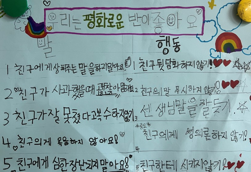 진정한 변화는 외부의 강제가 아니라, 자신의 선택에서 시작된다. 누구나 타인으로부터 존중받기를 원하며, 그것은 인간의 보편적인 욕구다. ‘공동체의 약속 만들기’는 학교라는 울타리 안에서 함께 살아가는 구성원들이 서로의 권리와 책임을 함께 고민하고, 갈등을 평화롭게 해결해 나가기 위한 주춧돌이 된다. 갈등이 생기더라도 서로 존중하며 풀어나가는 이런 과정들이야말로 경기교육이 추구하는 진정한 ‘상호존중’의 모습이다.
