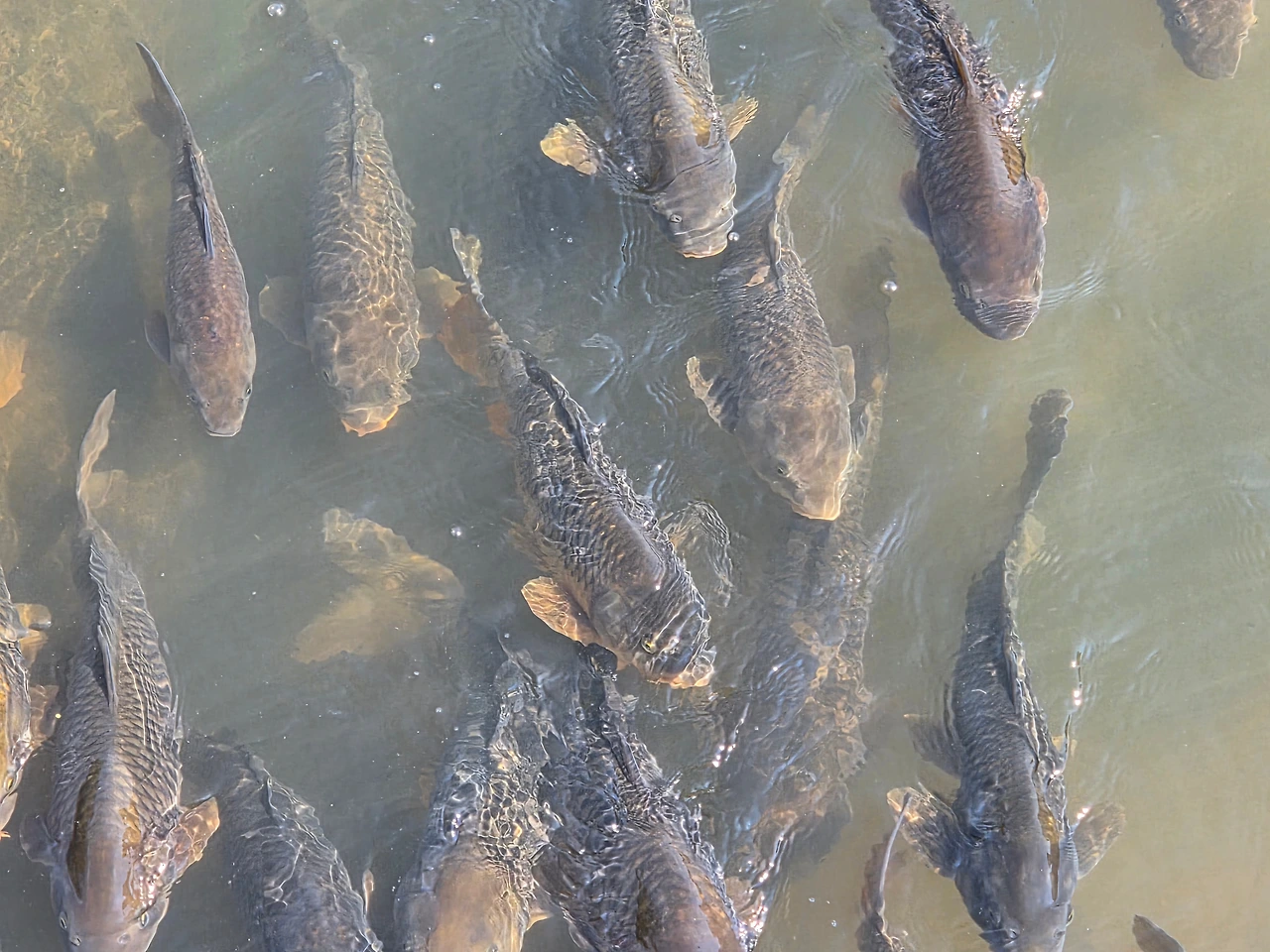 느린 물살에 몸을 맡겨 온 잉어 떼의 유영