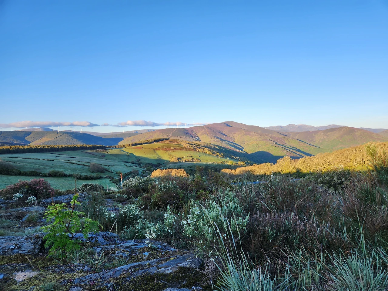 철의 십자가를 지나서는 계속 내리막이었다. 자갈이 깔려진 내리막. 만약 다리에 힘이 소진된 후 내려가는 길이었다면 너무 힘든 길이 될 뻔 했다. 길 양편으로 꽃이 핀 관목들이 늘어섰다. 이 꽃나무들의 이름을 불러주고 싶었다. 노란 꽃을 스페인행복, 흰 꽃을 스페인웃음, 보라색 꽃을 스페인생각이라 내 마음대로 이름 붙여 주었다. 스페인의 행복, 웃음, 생각이 활짝 핀 내리막을 걸었다.
