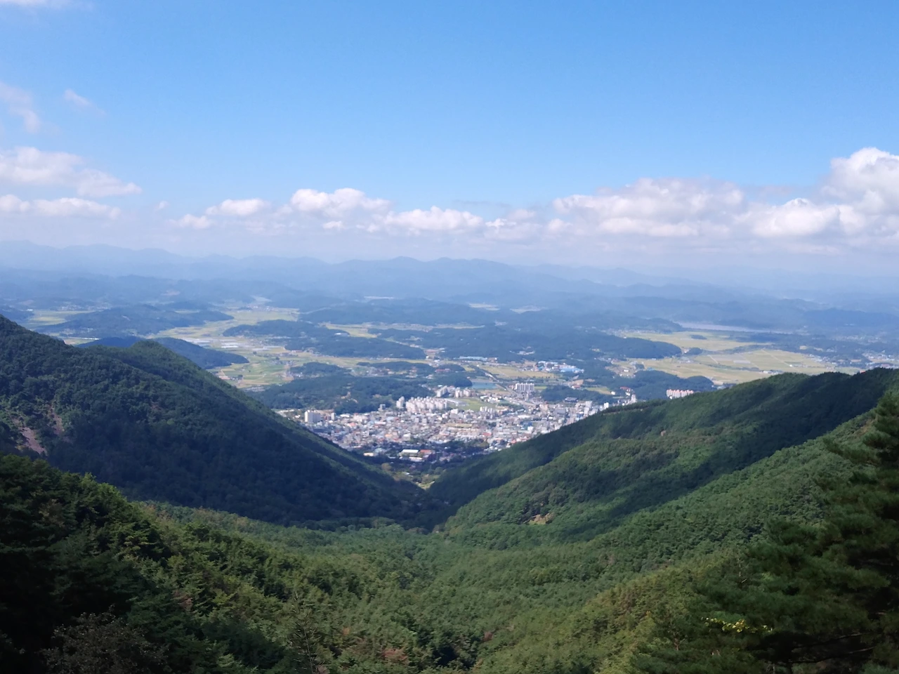 어느 정도 오르니 자하곡 골짜기 너머 창녕읍이 보이고 파란 하늘과 흰구름이 눈이 부시게 맑다.
