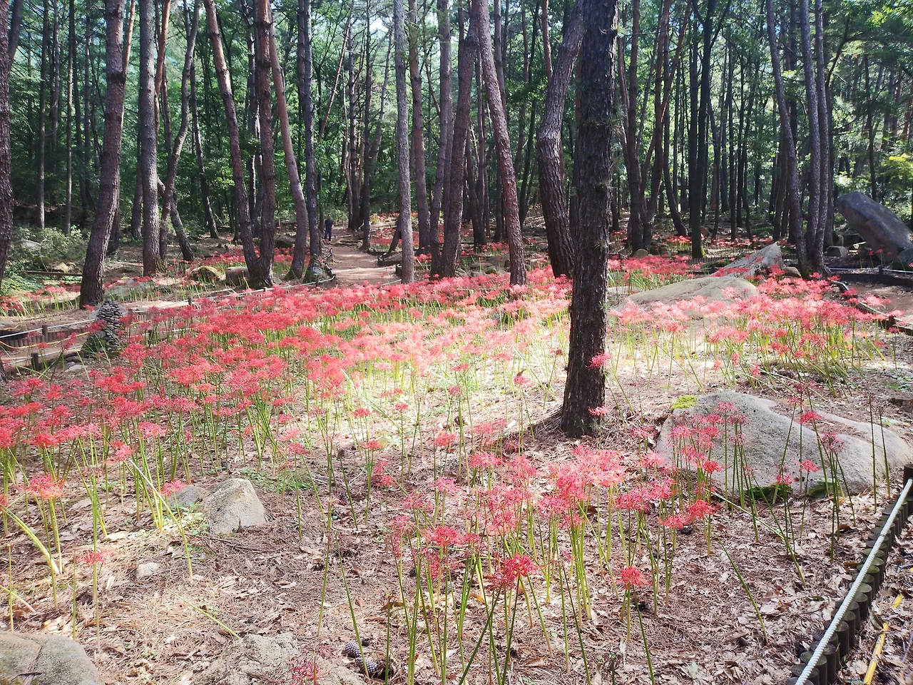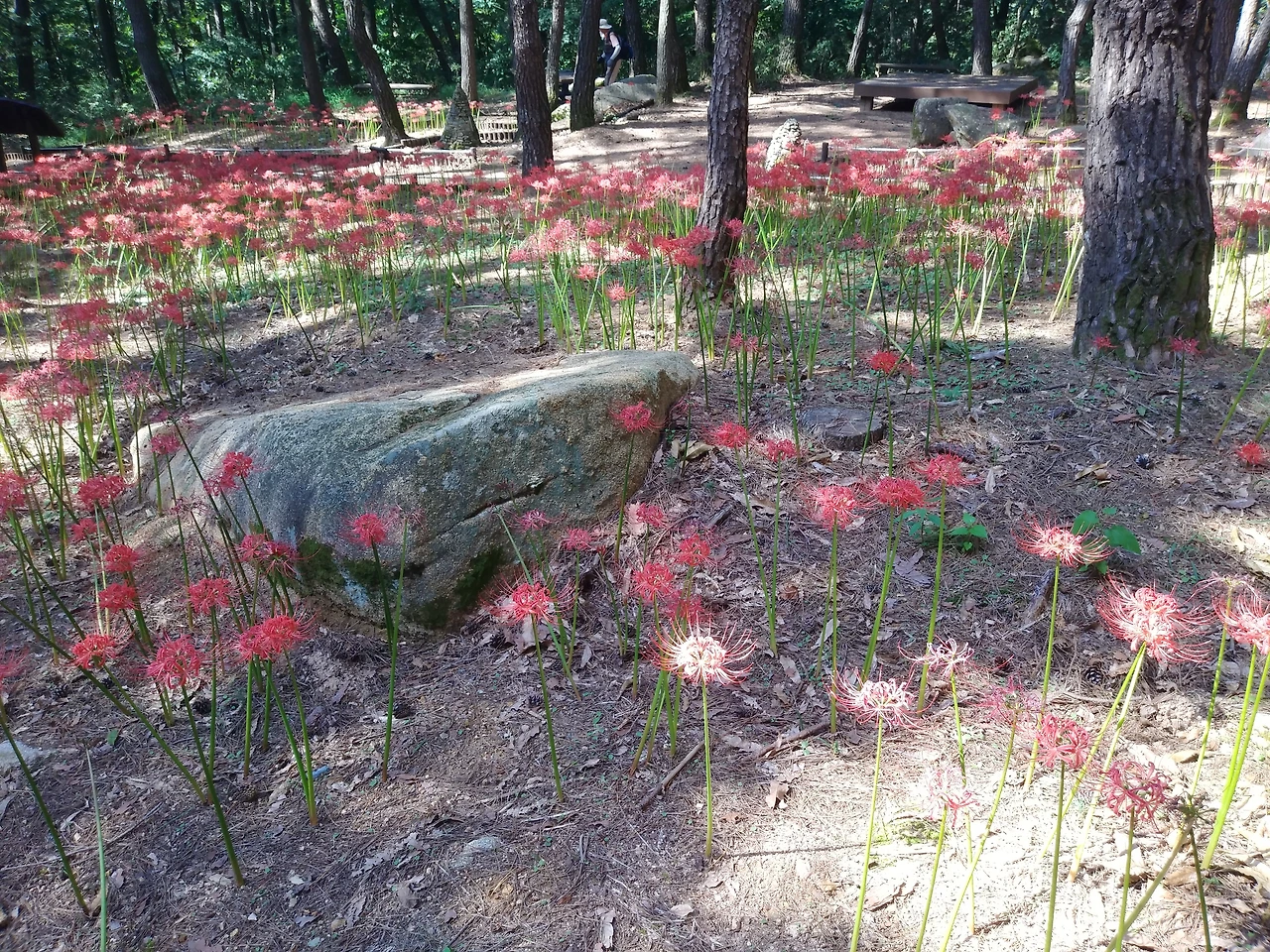 송이버섯 양생 지역인 소나무 숲에서 피톤치드가 가득 흘러나오고 산길에 코스모스와 꽃무릇 화원이 펼쳐져 있다.