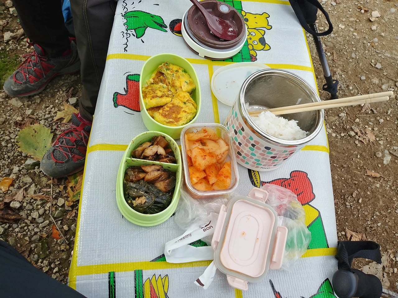 숲 속에서 서로 사진을 찍어주고 온 길을 되돌아 내려왔다. 마침 길 옆 사람 없는 빈 벤치에 자리를 잡아 도시락을 먹었다.