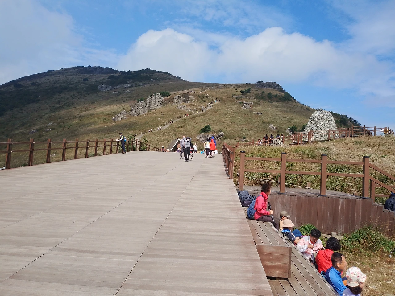 메지 않은 젊은 남녀들과 아이를 대동한 가족팀 등 많은 인파가 산길을 따라 걸어간다.