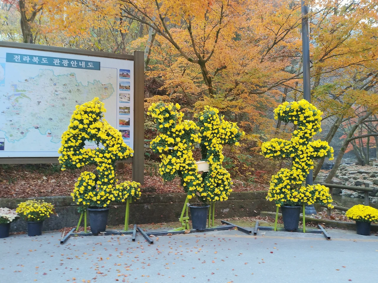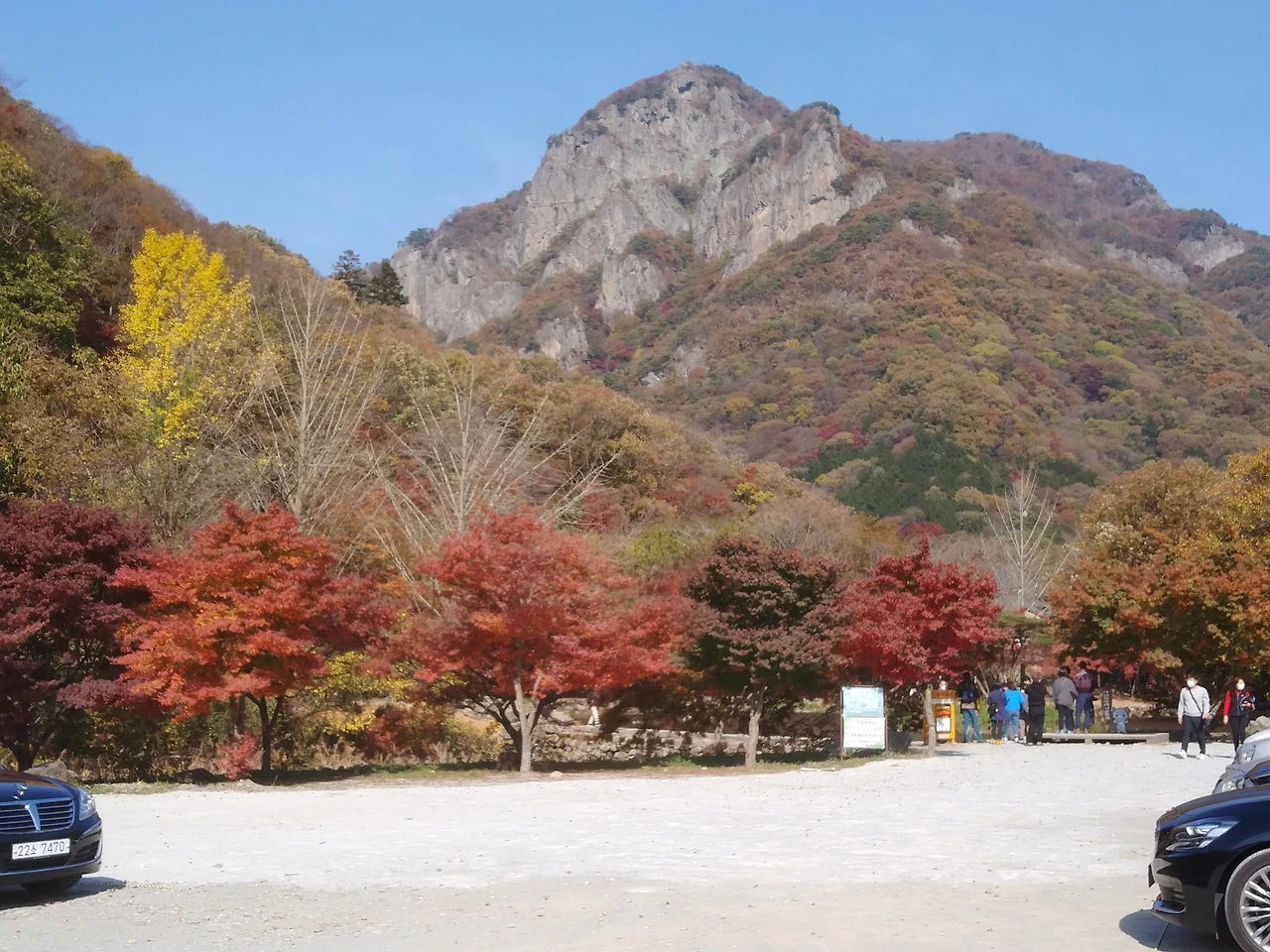 우리는 강천산 6km의 산책을 끝내고 곧바로 내장산으로 차를 달렸다. 높은 산을 넘으니 저 아래 국립공원 내장산 입구 마을이 보인다. 주차장은 이미 만차여서 식당에 주차의 대가로 산채비빔밥을 먹고 도로를 따라 걷기 시작했다.