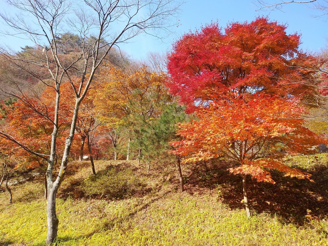 안개도 걷히고 아침 햇살이 비치니 단풍의 색깔이 살아 움직이는 듯하다.