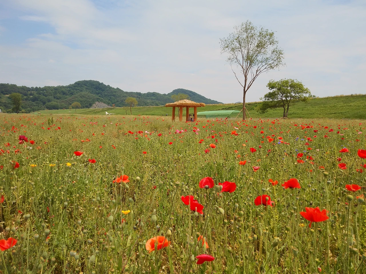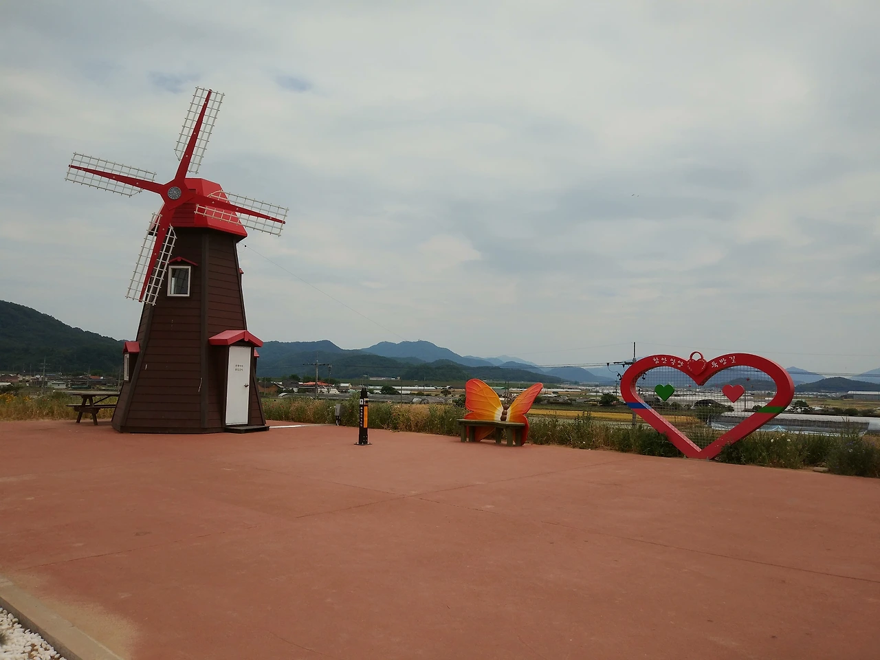 빨간 풍차가 보이는 둑 위에 오르니 넓은 고수부지 위에 꽃밭이 펼쳐져 있다. 멀리 강물과 둑이 보이고 바로 앞에 경비행기와 활주로, 원두막도 있다.