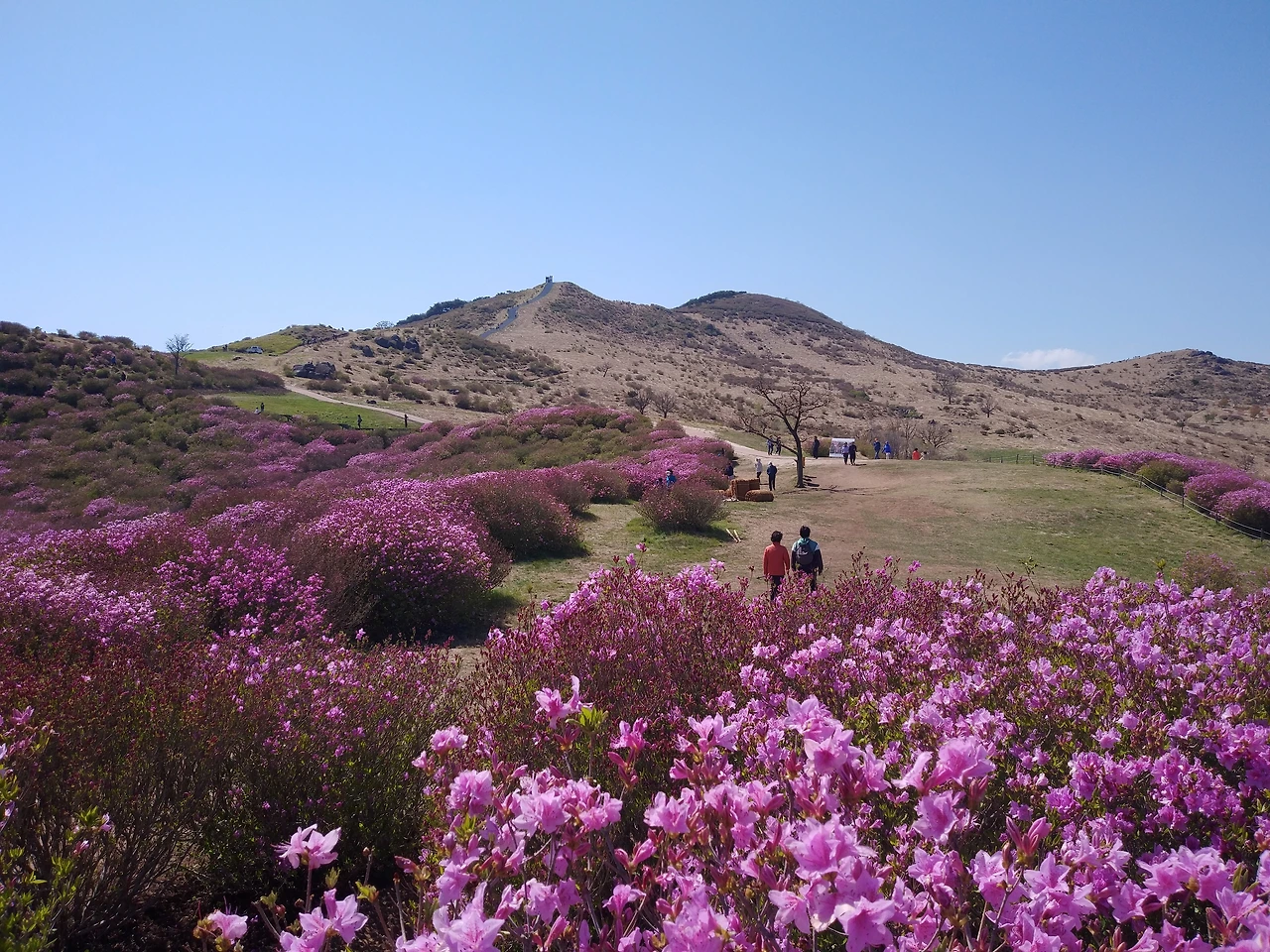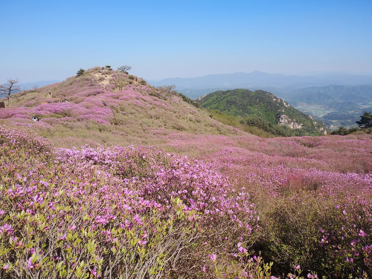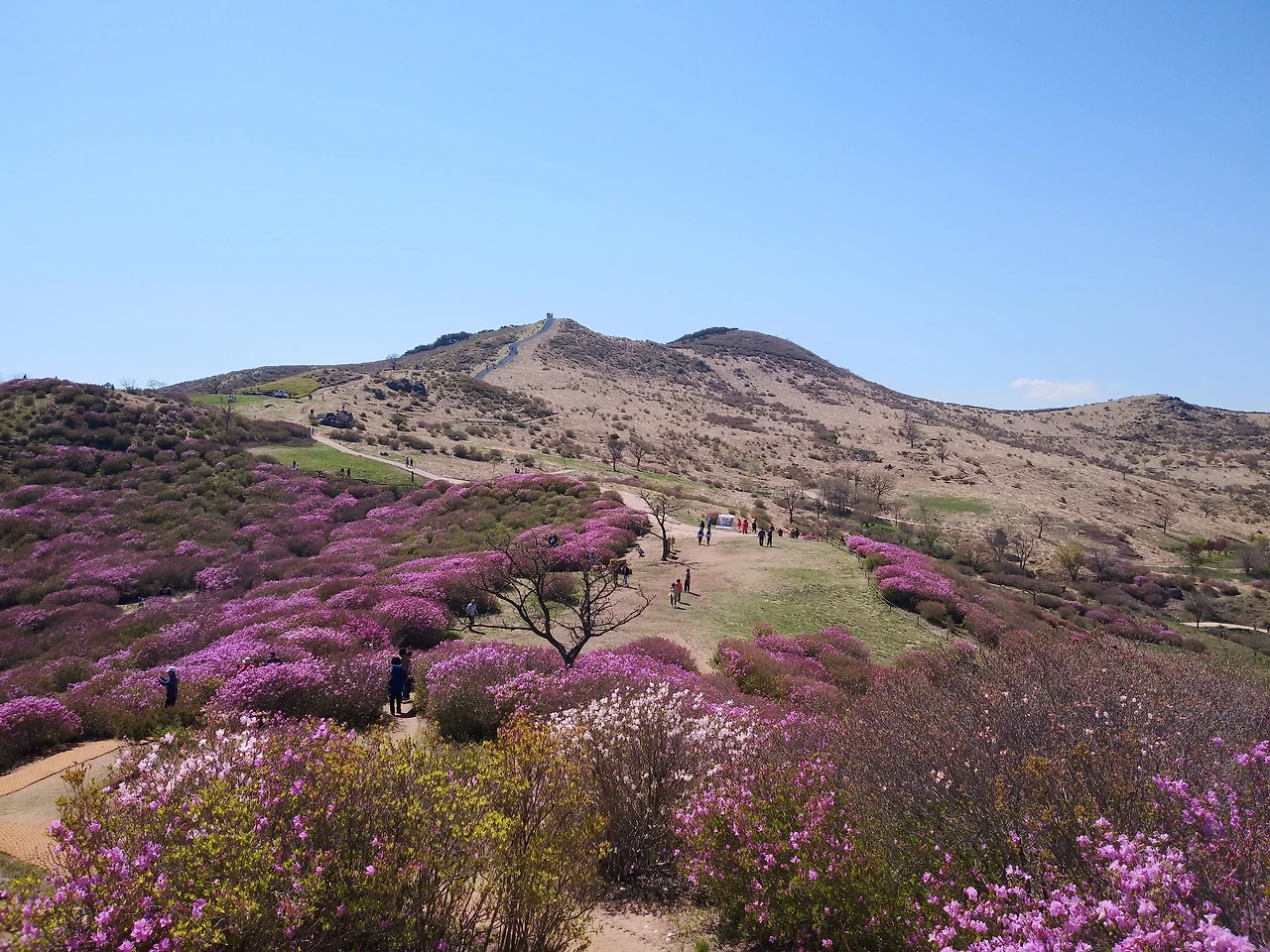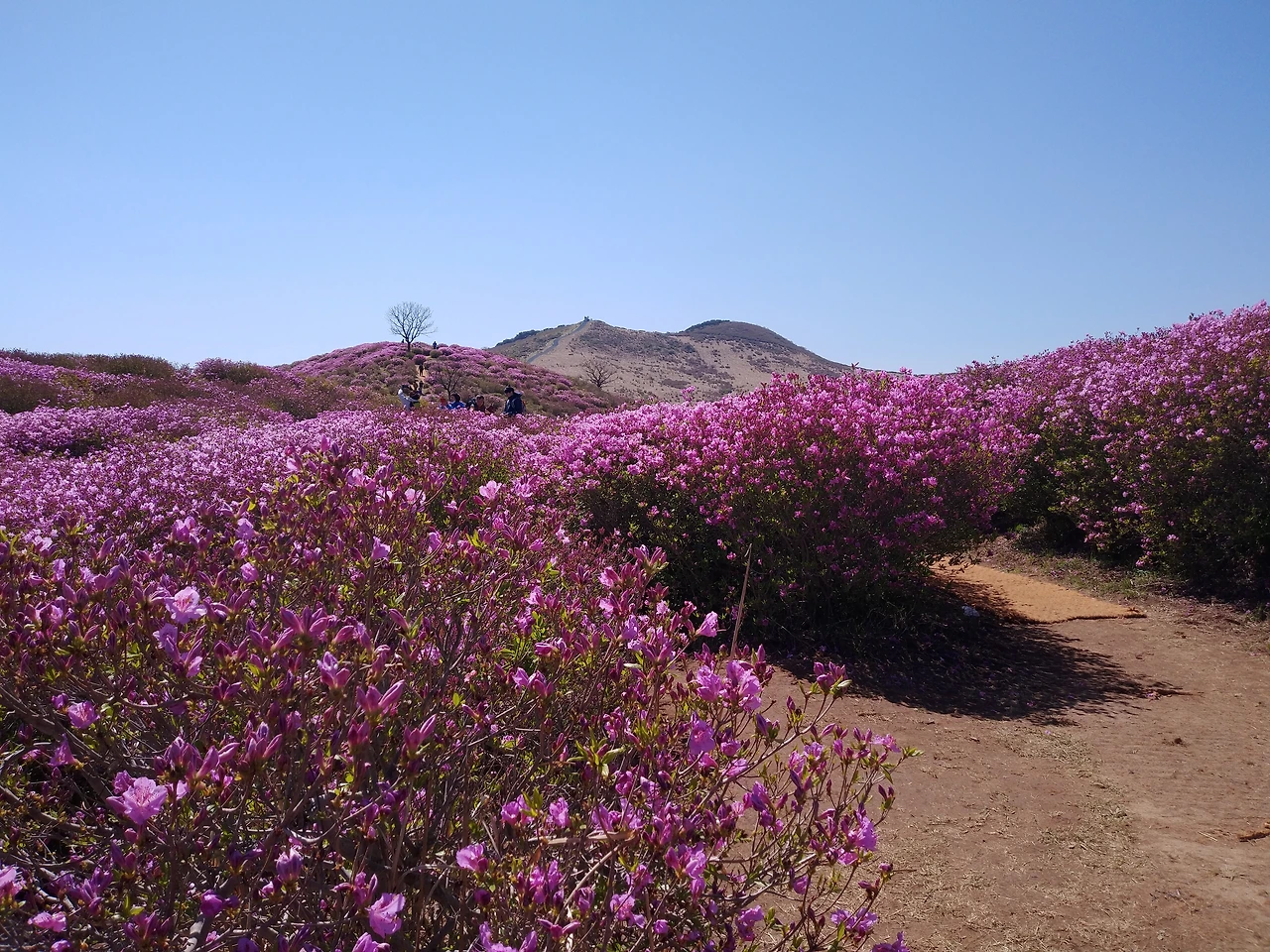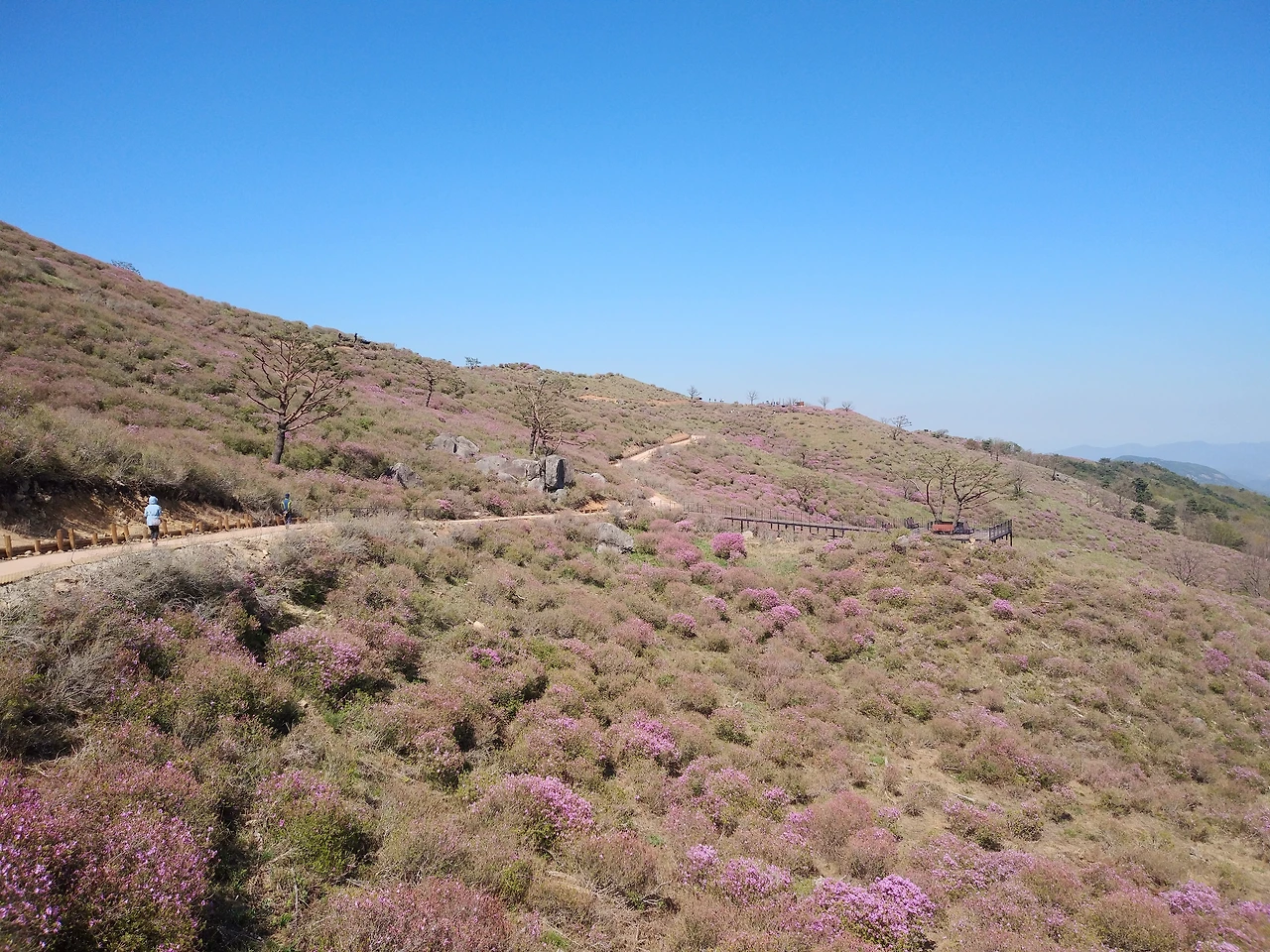 3 군락지 둘레길을 걸었다. 철쭉 속 우뚝 선 소나무가 고고하다. 높은 지대라 이제 봉오리가 막 피어오른다. 반환점 벤치에서 따뜻한 무차를 마시며 한참을 앉아 있었다.