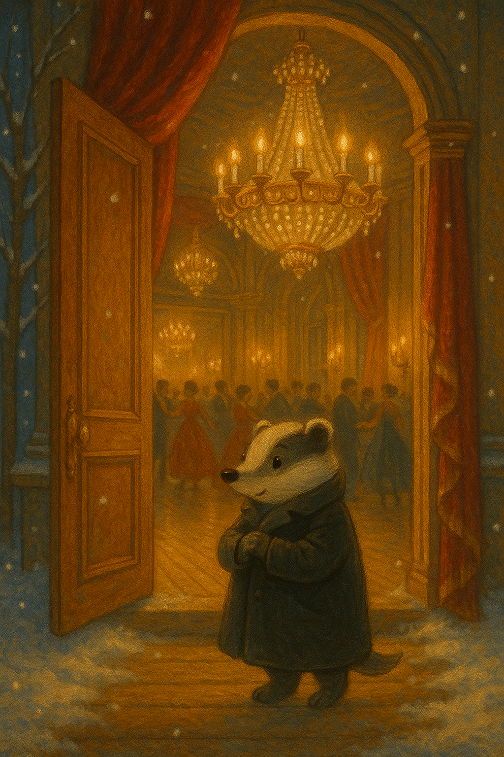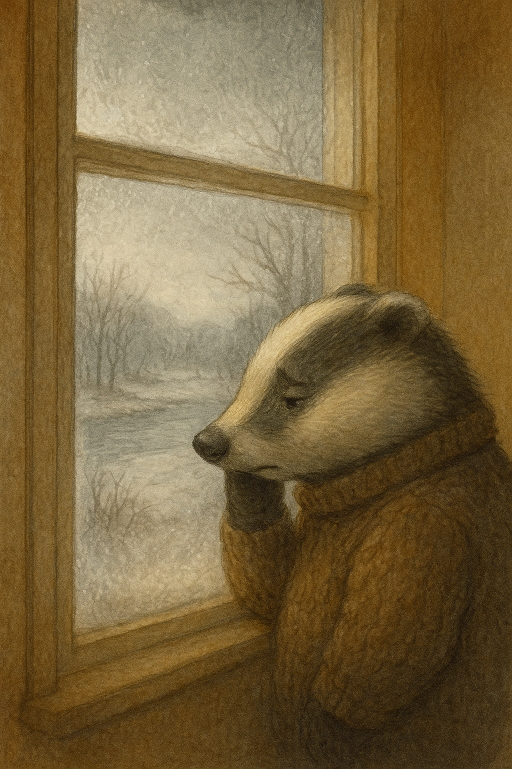 따뜻한 방 안에서 얼어붙은 강을 바라보는 오소리.