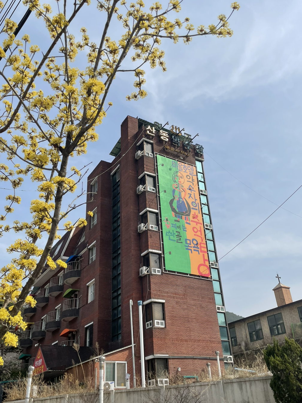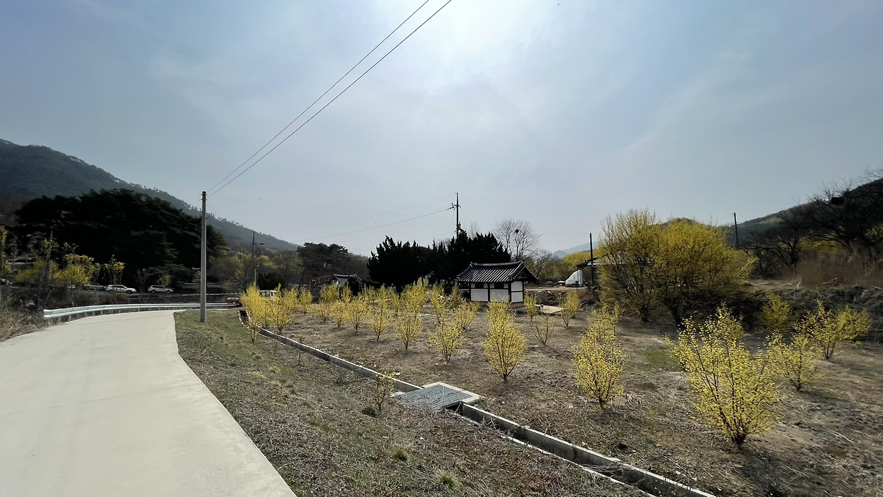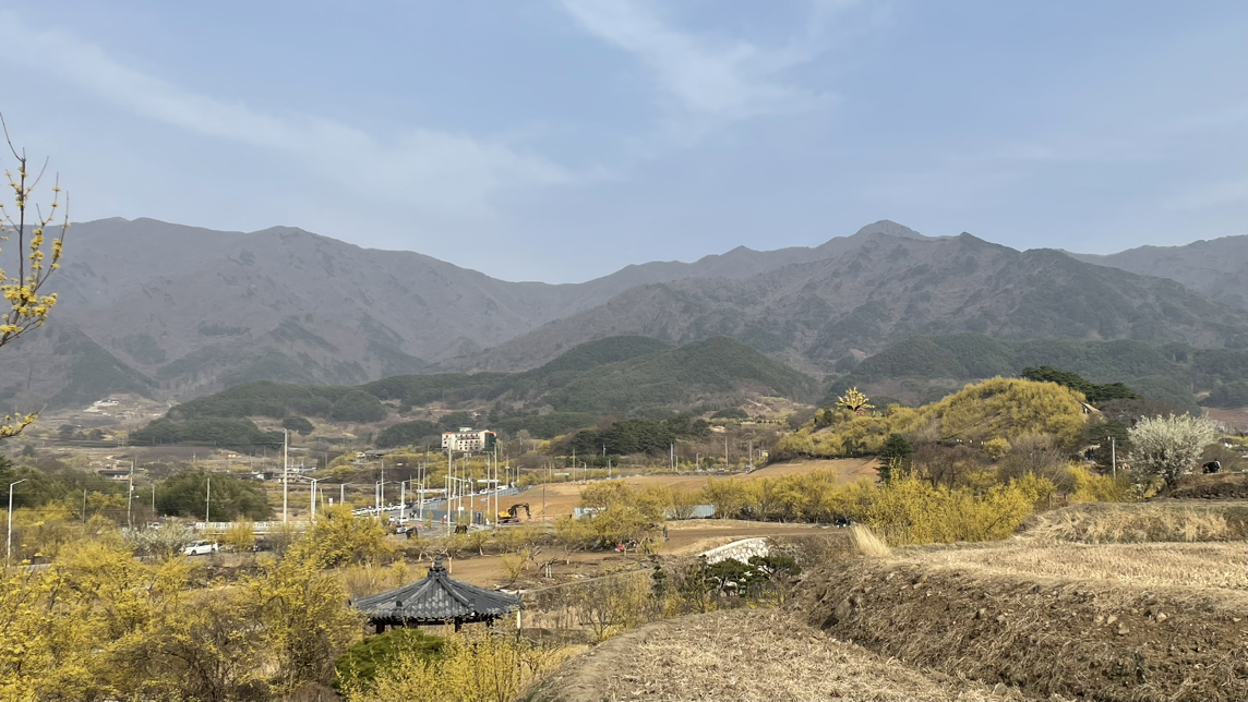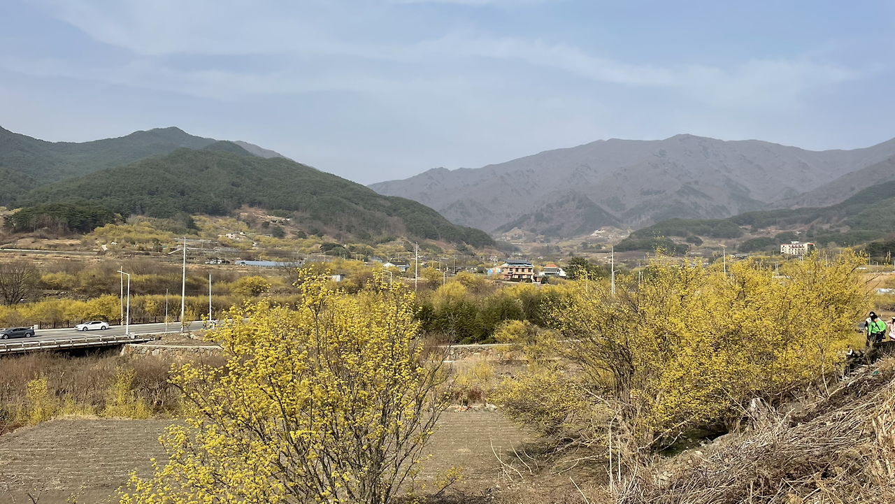 샛노란 봄꽃과 마을 풍경을 멀리서 보며