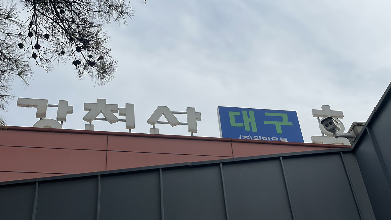 입구의 현대식 건물과 공사 중인 황량한 들,