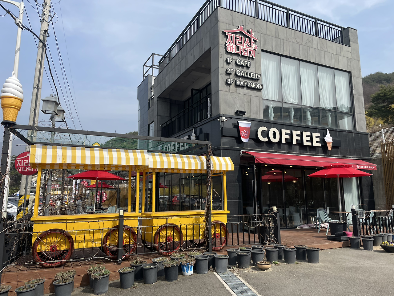 한 시간 넘게 걸었는데 아직 주차장도 못 가고 목도 마르고 걷다 보니 더워져서 초입에 있는 카페에 들어갔습니다.