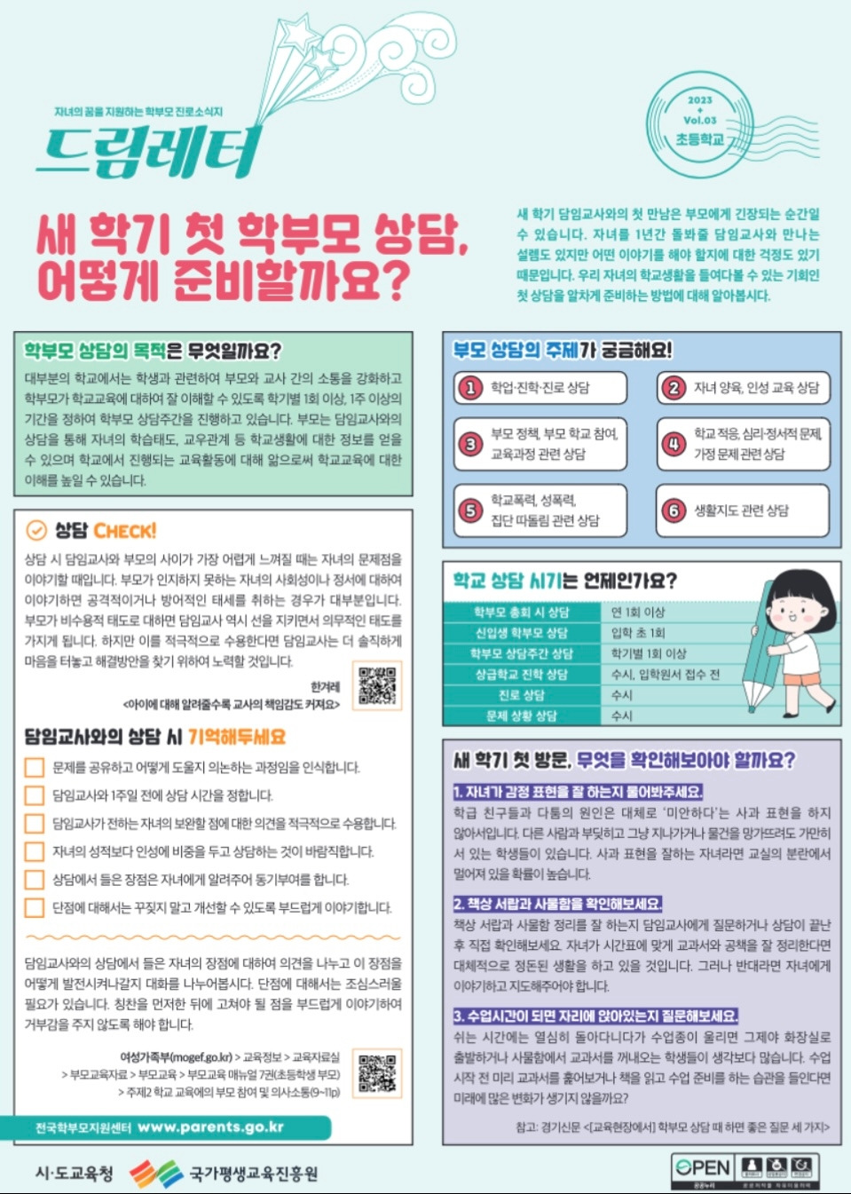 참고로 교육부 주관 자녀 진로지도 역량 함양을 위한 학부모 진로소식지 [드림레터]의 상담 관련 [새 학기 첫 학부모 상담, 어떻게 준비할까요?] 내용입니다. 상담 전 읽어보시면 도움이 되실 겁니다.