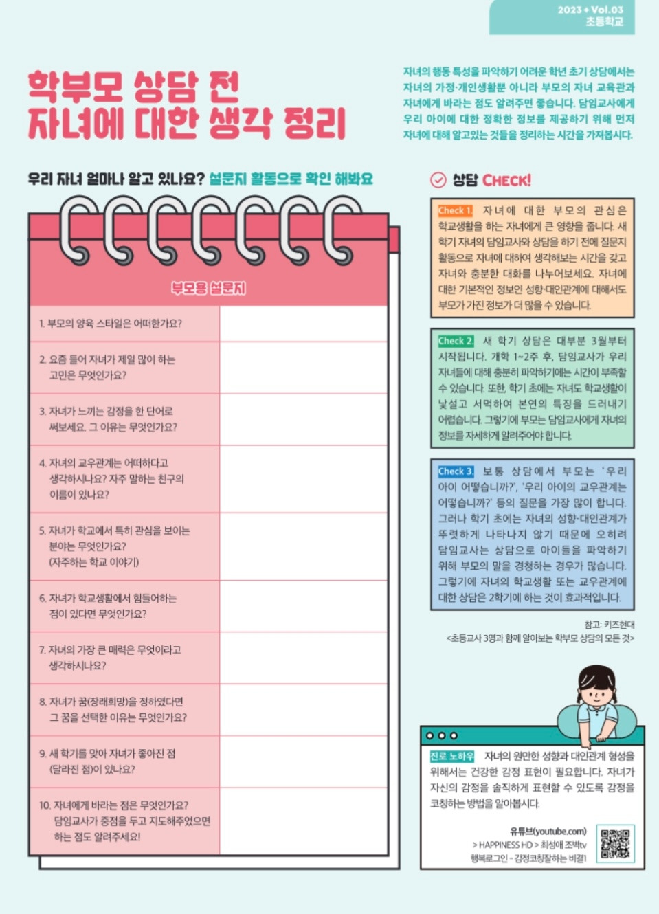 학부모 상담주간은 1년에 2회, 학기당 1회씩 있고 특히, 1학기 상담주간은 만난 지 한 달여밖에 지나지 않은 시기여서 선생님께 듣는 것보다 내 아이에 대한 기본 정보를 제공하여 1년 동안 선생님께서 내 아이에게 맞춤형 교육 및 돌봄을 하실 수 있도록 유도해야 합니다.