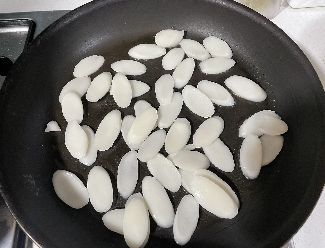 기름을 두른 후 떡국떡을 골고루 펴서 놓기