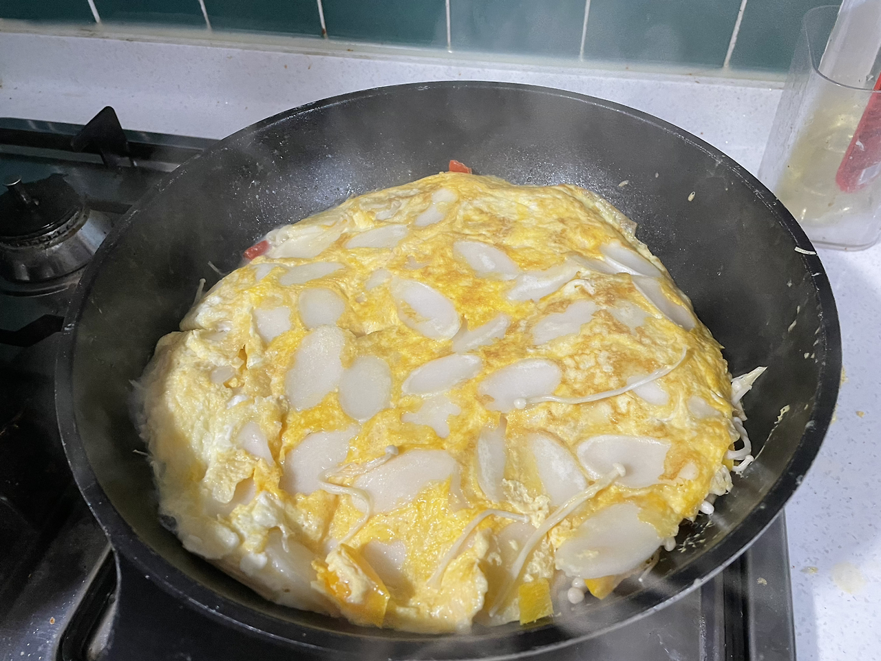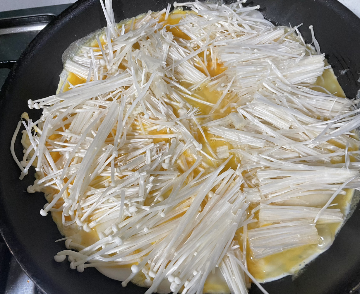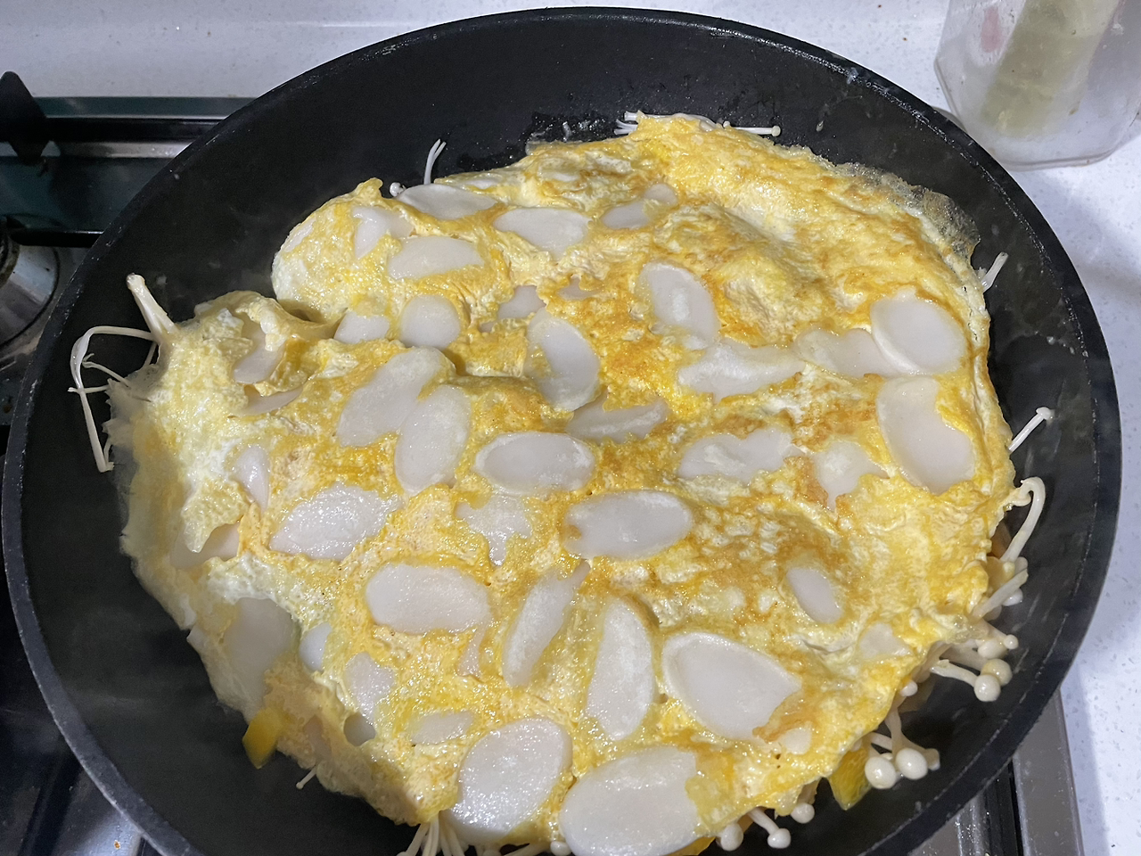계란물을 떡이 잠기게 붓고 팽이버섯 올리기