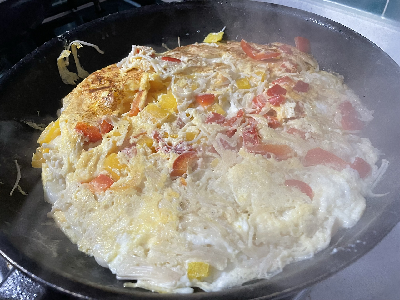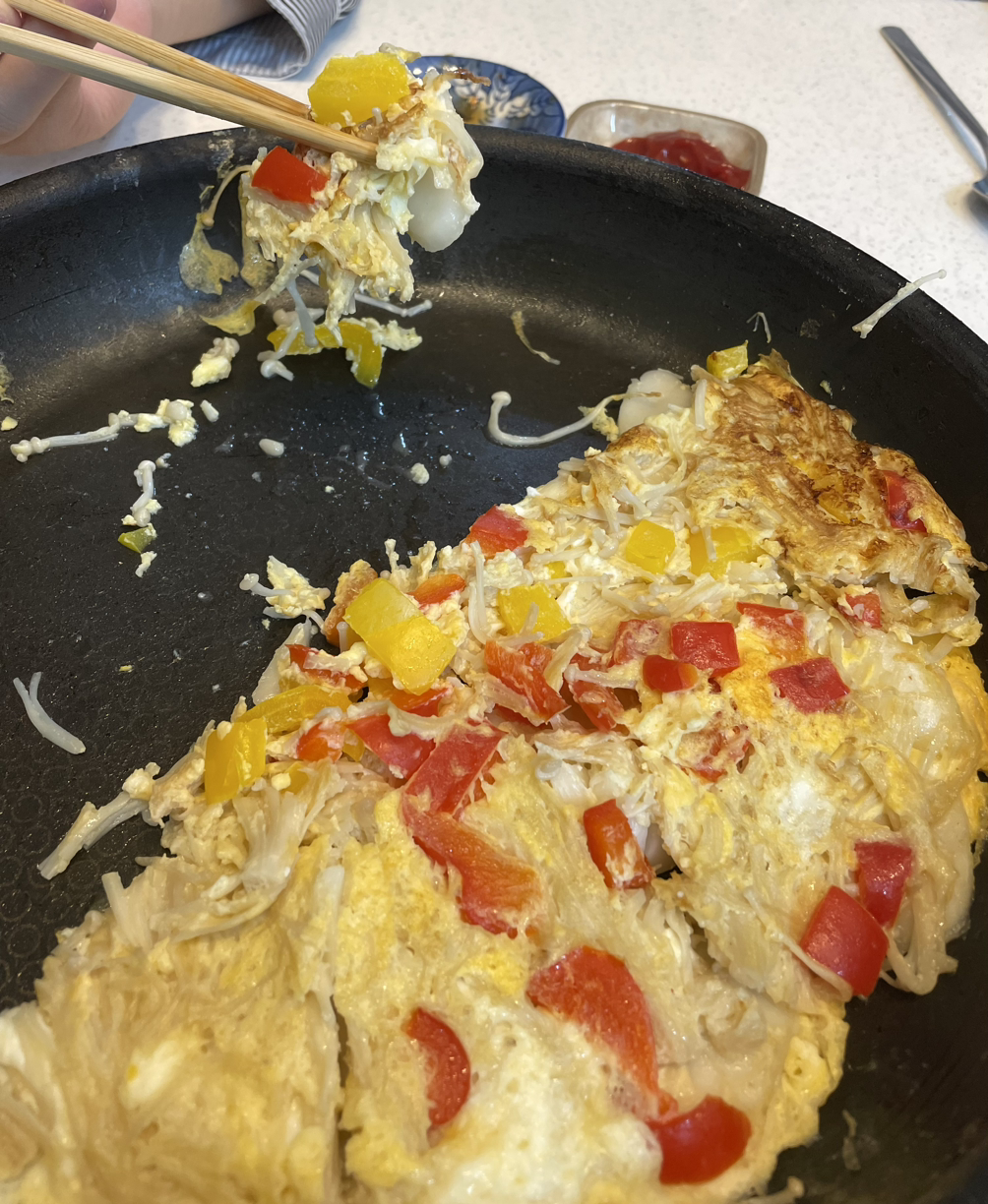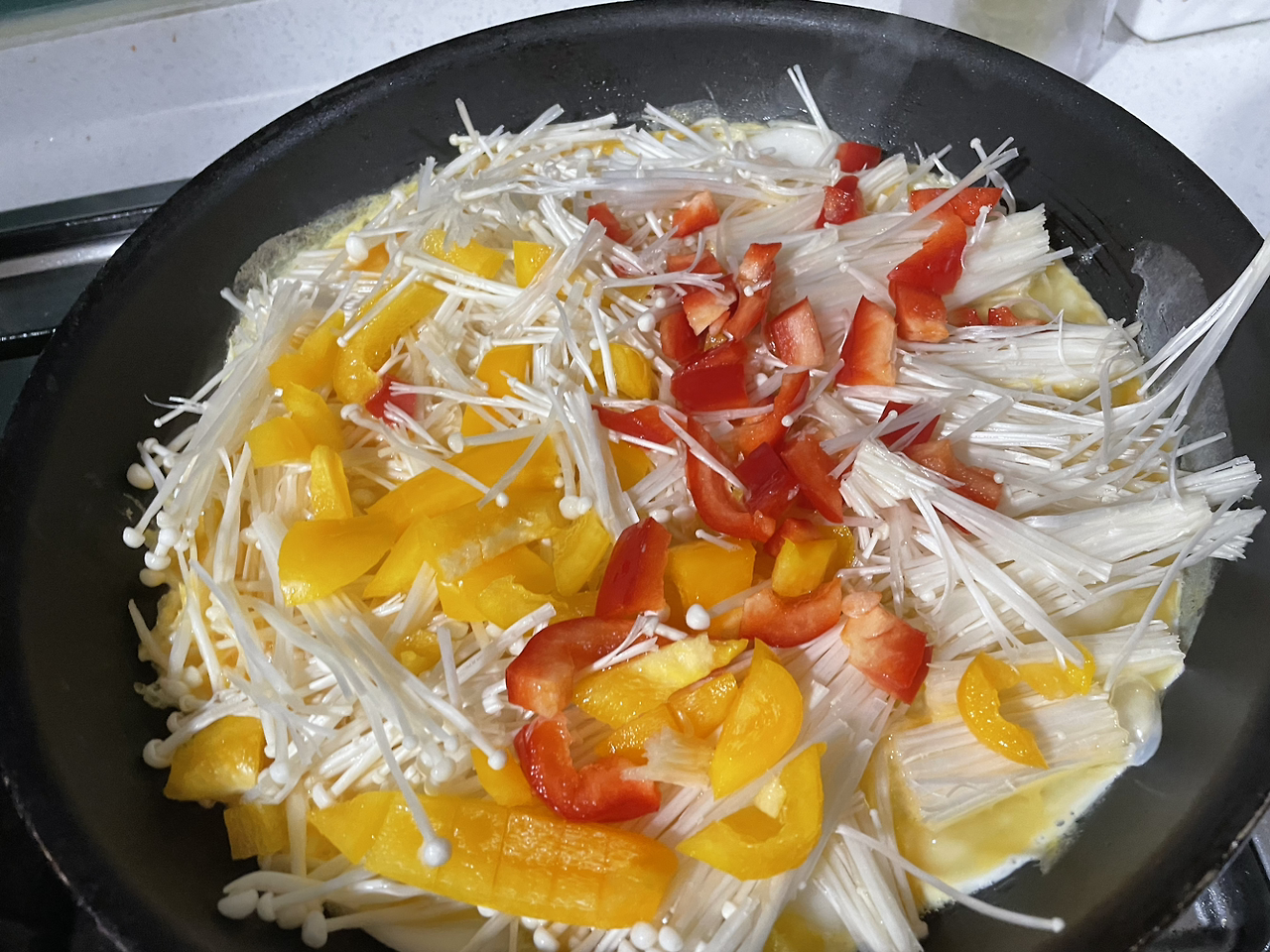 계란물을 떡이 잠기게 붓고 팽이버섯 올리기