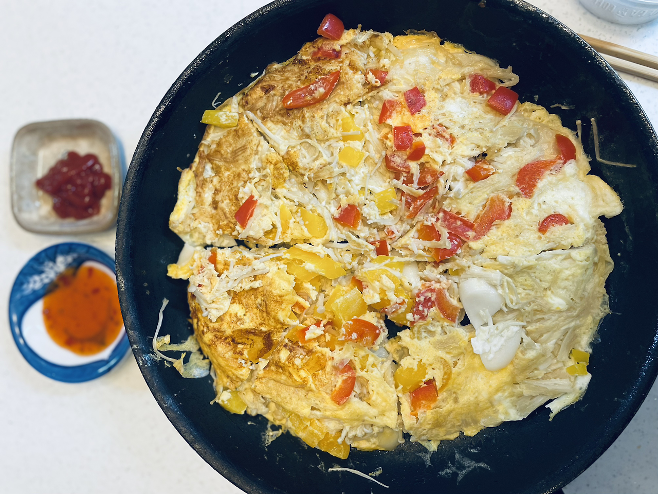 양쪽면이 잘 익으면 잘라서 입맛에 맞는 소스 곁들여 먹기아주 든든한 아침밥이었습니다!