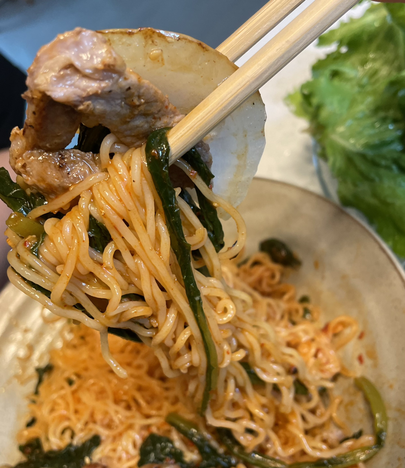 3. 비빔면 소스와 열무김치를 넣고 비비기