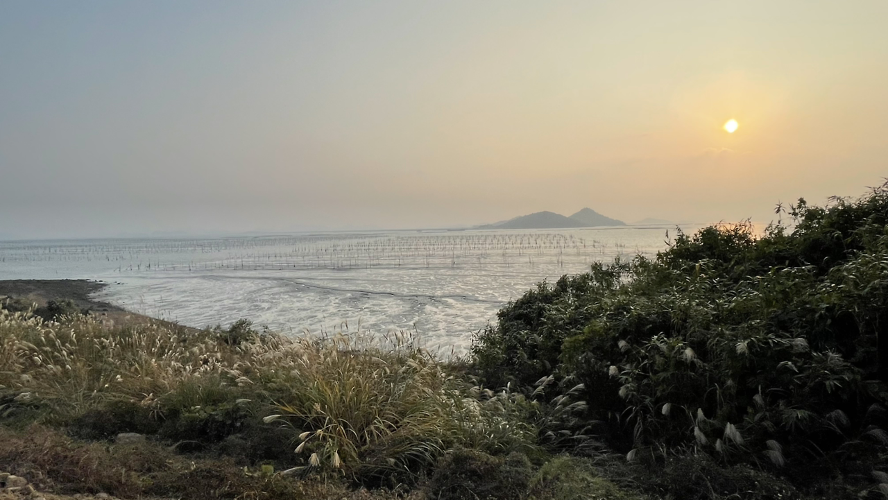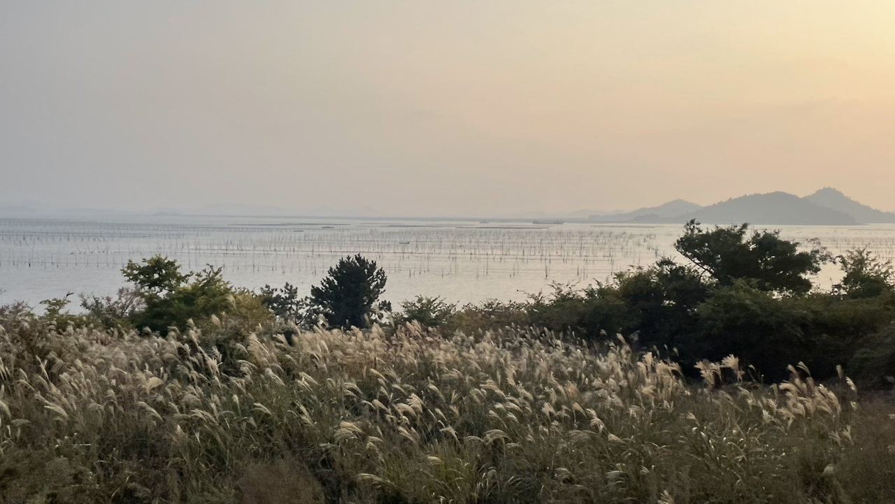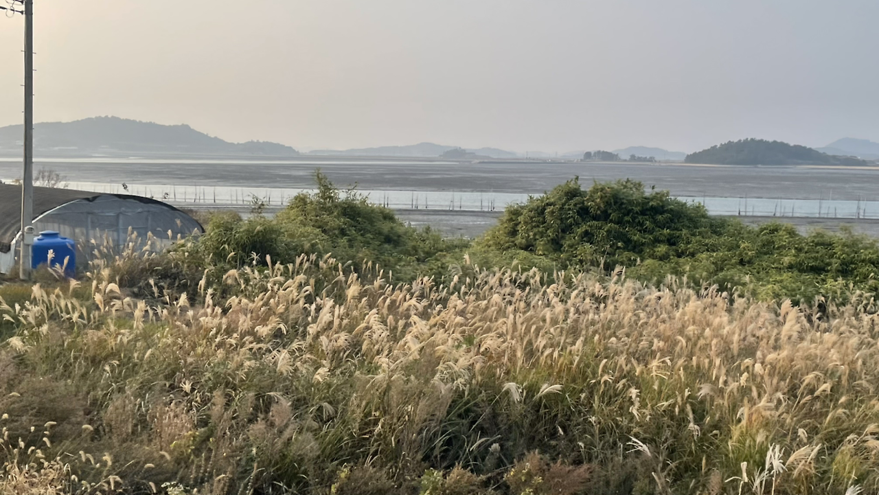 섬 주변엔 보라색 꽃들이 가득 피어 있고