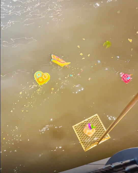 저녁 9시쯔음, 강에서는 이미 러이 크라통 행사를 진행중이었다. 방송국에서도 이곳을 촬영중이었고, 꽤나 많은 인터넷 방송 하는 사람들도 있었다. 우리는 그 인파를 뚫고 강 가까이로 이동했다. 백화점 직원으로 보이는 사람들이 긴 막대기로 크라통을 강으로 내려주고 있었다. 우리도 크라통에 촛불을 붙이고 각자 소원을 빌었다. 나는 '이번 여행 아프지 않고 잘 마무리 되게 해 주시고, 저와 만난 모든 이들이 행복해 지길 바랍니다.'라고 소원을 빌었다. 그렇게 강을 따라 우리의 소원이 담긴 크라통을 보냈다.