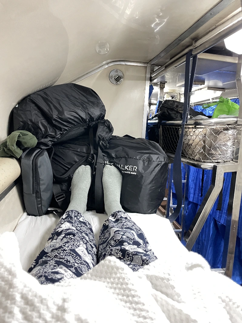 6시 35분, 목이 다시 아파와서 목캔디(?)를 먹는다. 물을 마시고 싶은데, 화장실 때문에 타기 직전에 마시려고 한다. 몸은 비에 다 젖어 피로감이 쌓이고 있다. 7시 45분, 드디어 기차는 출발한다. 내가 예매한 슬리핑석은 저렴한 축에 들어서인지, 매우 비좁은 공간이었다. 하지만 뭐 나쁘지는 않았다. 짐 놓을 장소가 없어 완전히 눕기에는 비좁았을 뿐. 에어컨은 왜 이리 세게 틀었는지, 얼굴이 시려서 잠을 거의 못 잤다.