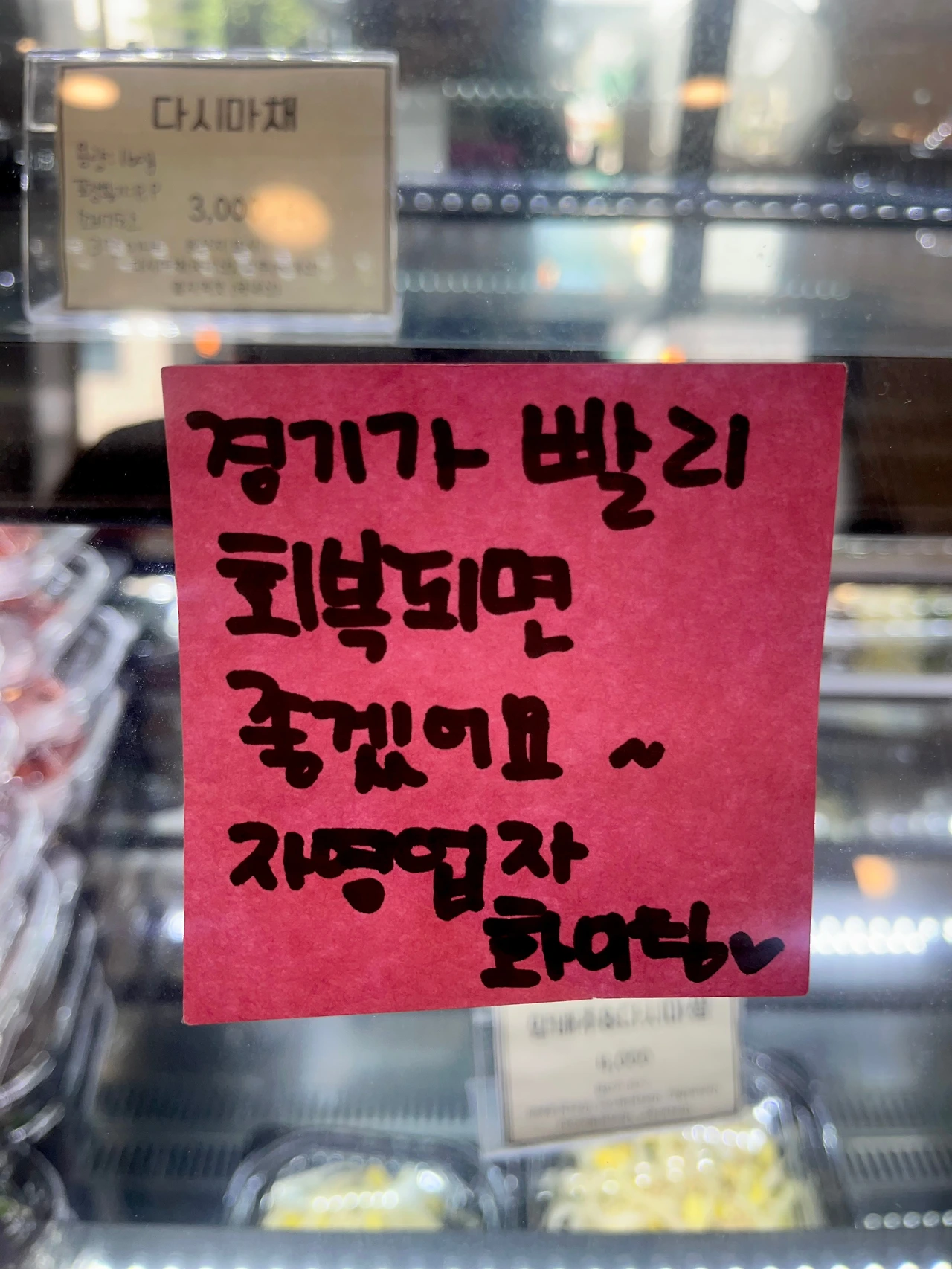 맛있는 깍두기가 생각나는 사각형의 손글씨에 파이팅을 더했다. 가게에서 나오는 길, 서비스로 잡채를 주겠다는 천사의 손을 물리쳤다. 공짜를 좋아하지만 윤기 나는 잡채를 날름 먹었다간 ’맛때가리’ 하나 없었을 것이다.