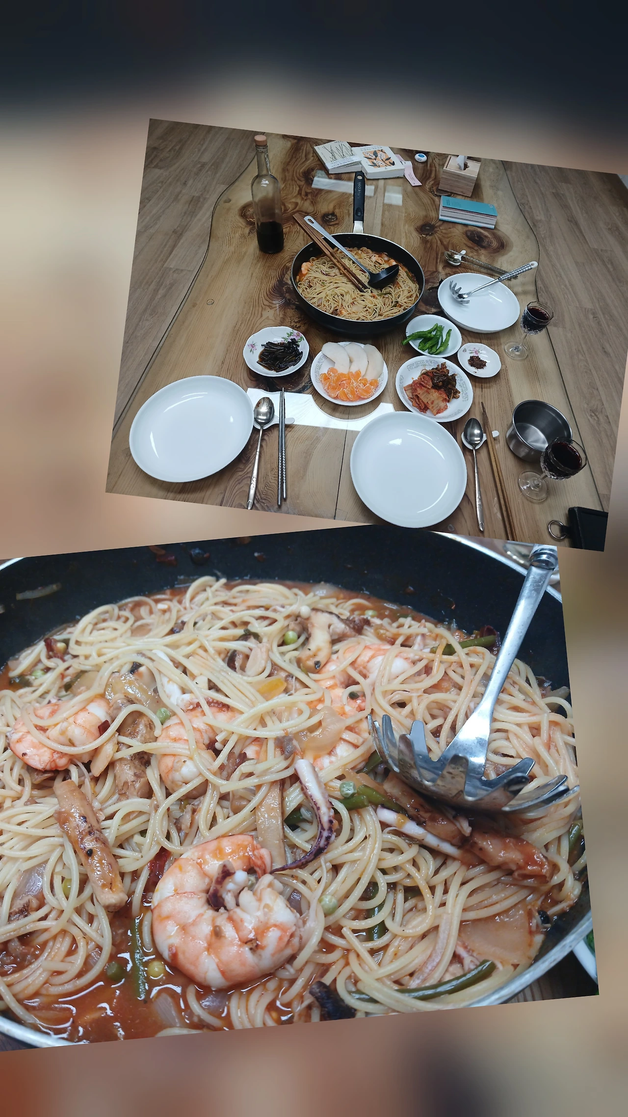 저녁에 그 재료들을 추가하여 동생의 '송이 해물 토마토파스타'를 도와 차려냈다.