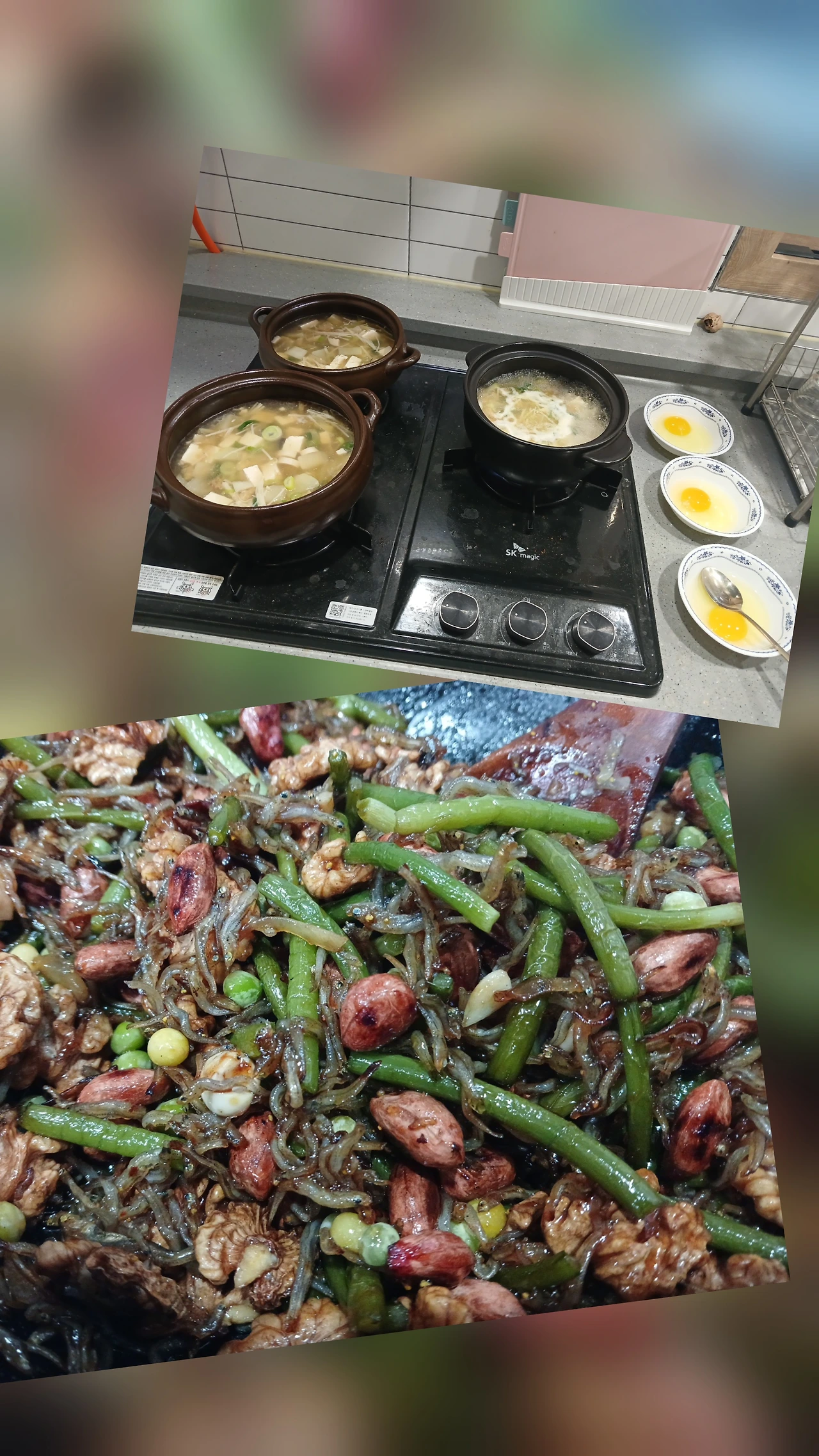 '황태국밥'뚝배기 3그릇에 담아 끓으면 계란 풀어주려