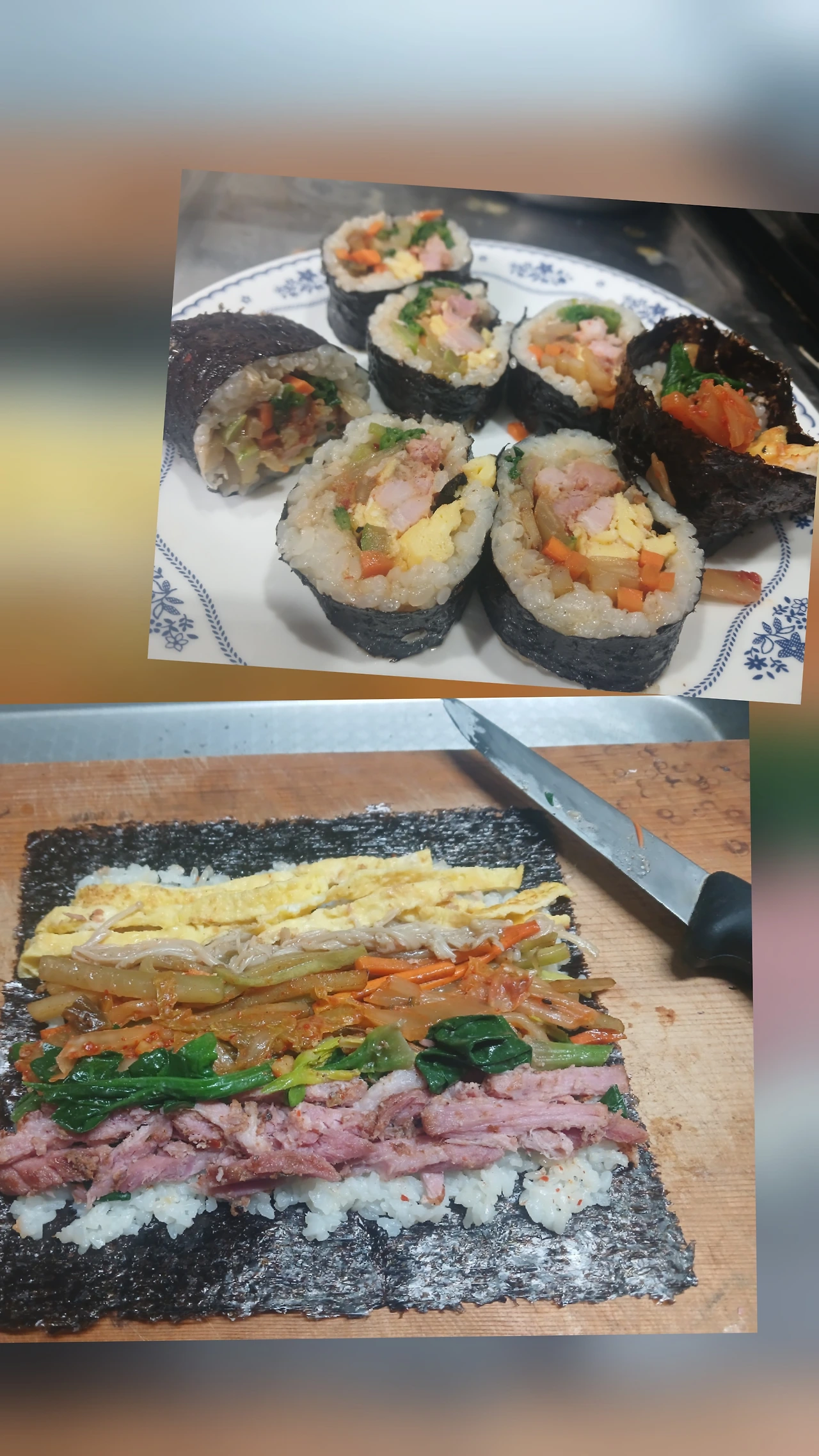 1'죽염 간 들기름 밥'부터 고루 잘 안 펴 짐/2 김밥 속 재료 간은 잘 맞추었는데 문제는 김밥 끝이 자꾸 벌어짐.