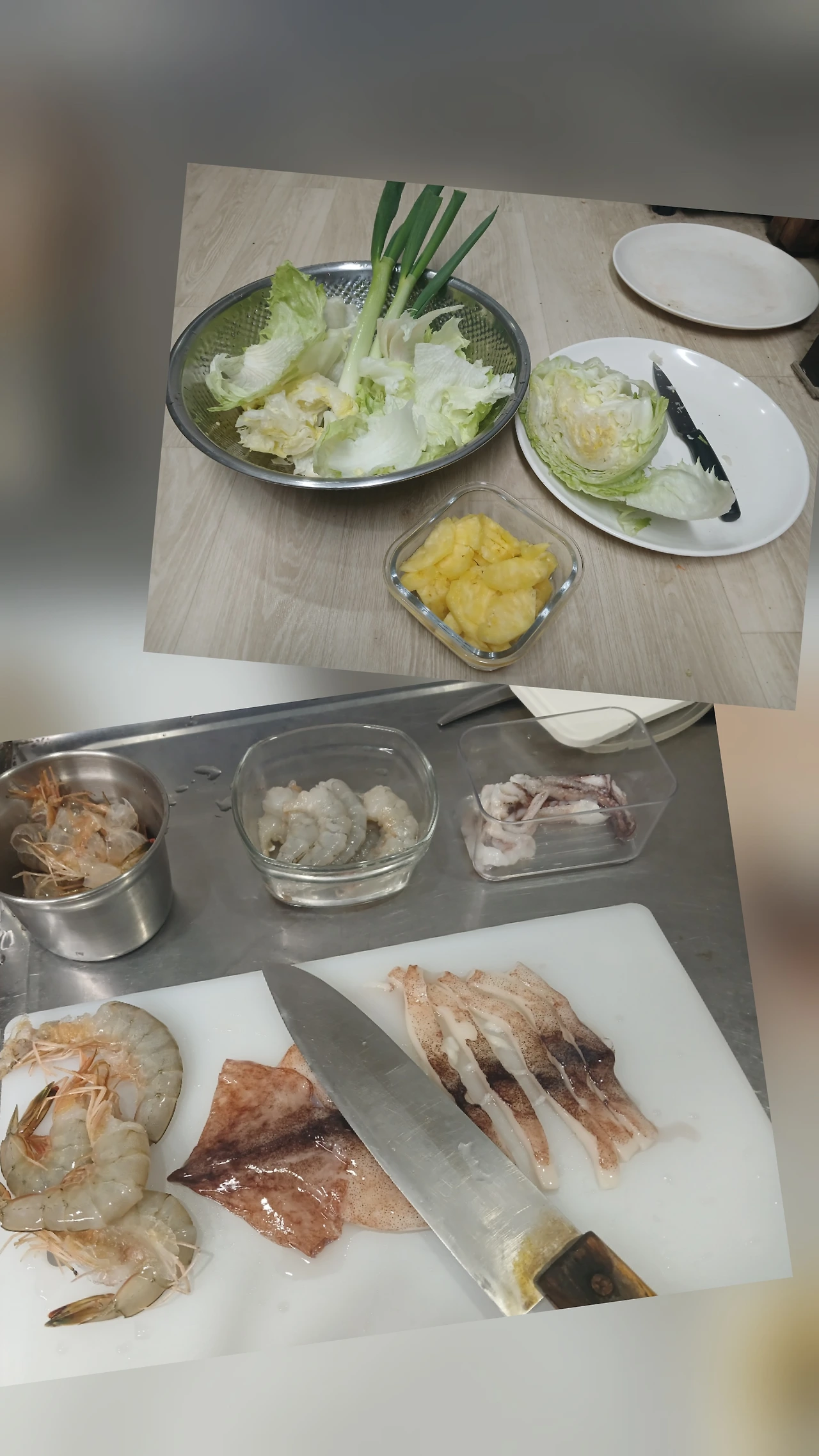 해동된 대하새우 껍질 벗기고 오징어 튀김용으로 길게 썰어두었다.