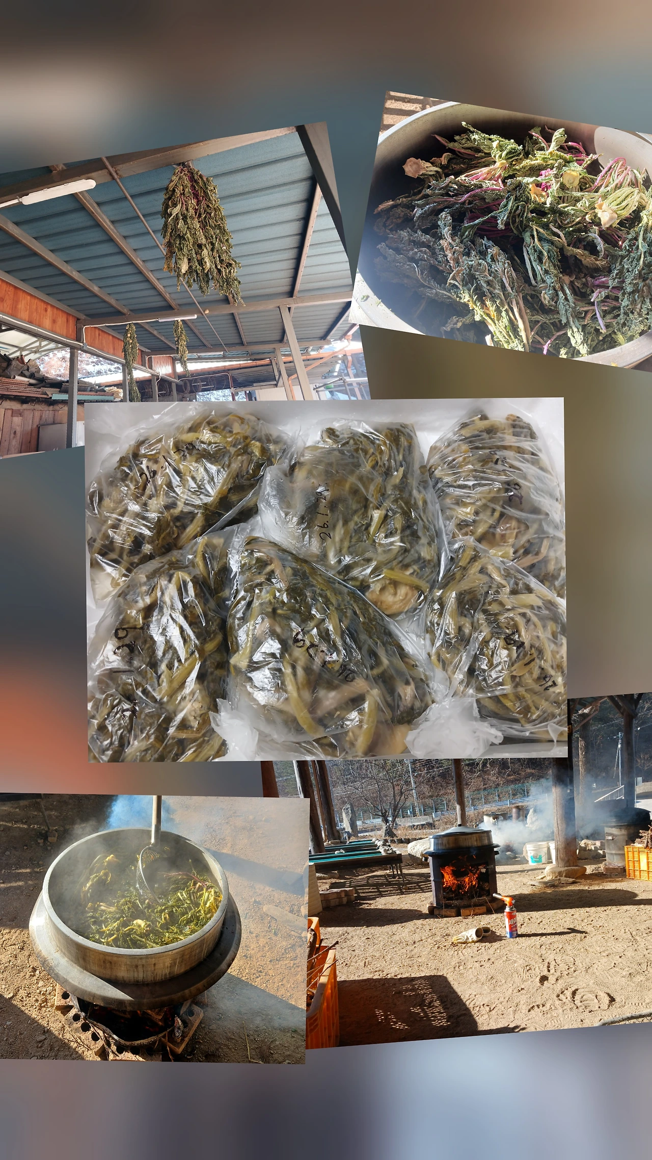 "재현아 바람에 떨어진 시래기묶음 다시 걸지 말고 양은솥 걸어 삶아 찬물 2번 헹궈서 다용도실 들여놔라.