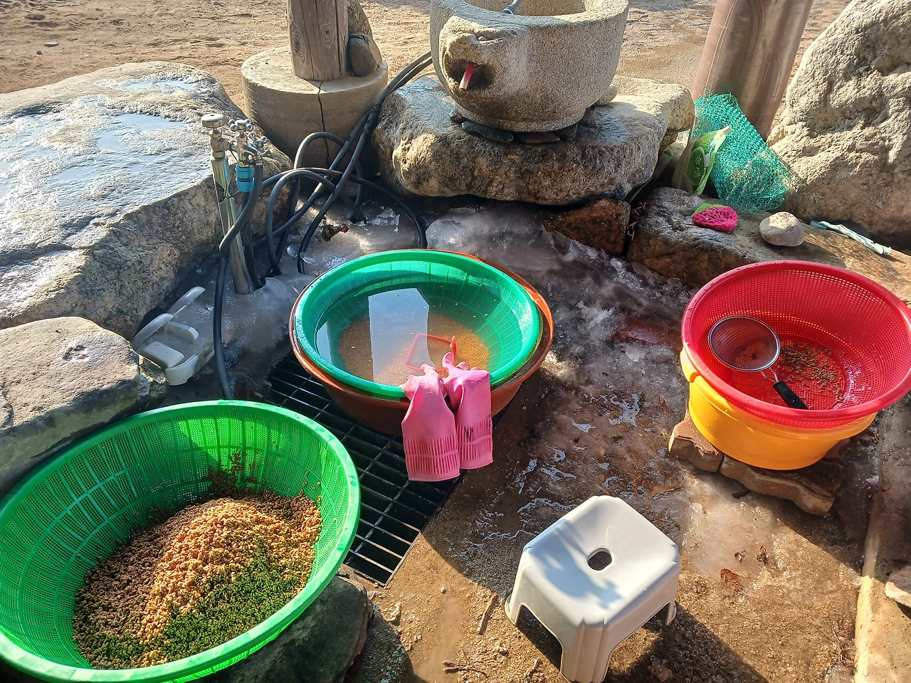 밀 보자기로 모았다 다 싶여 싹싹이주걱으로