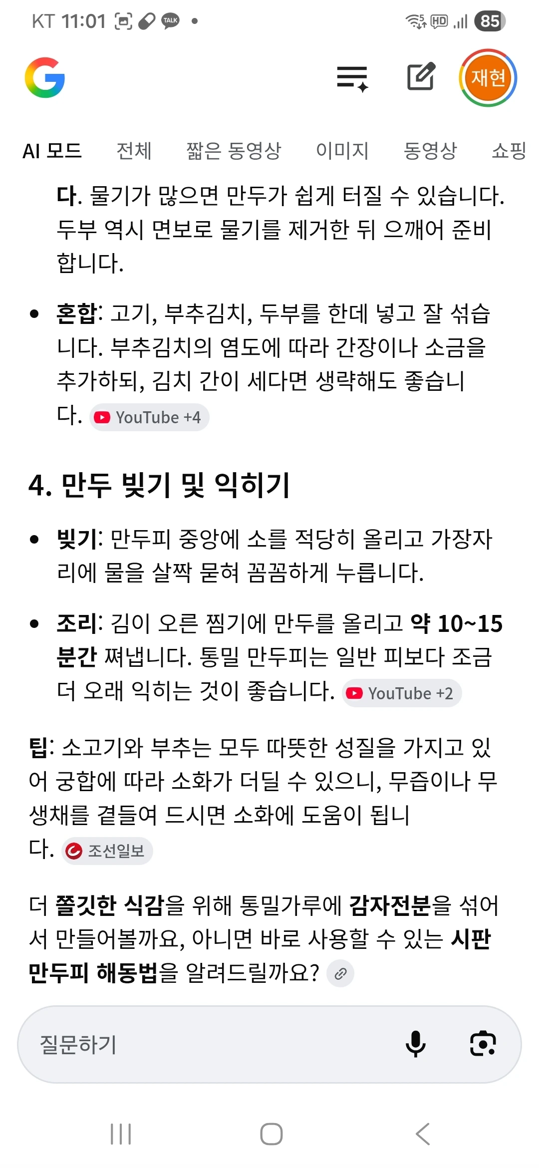 '점심 겸 참 통밀만두 저녁 안동찜닭 그리고 크런치'