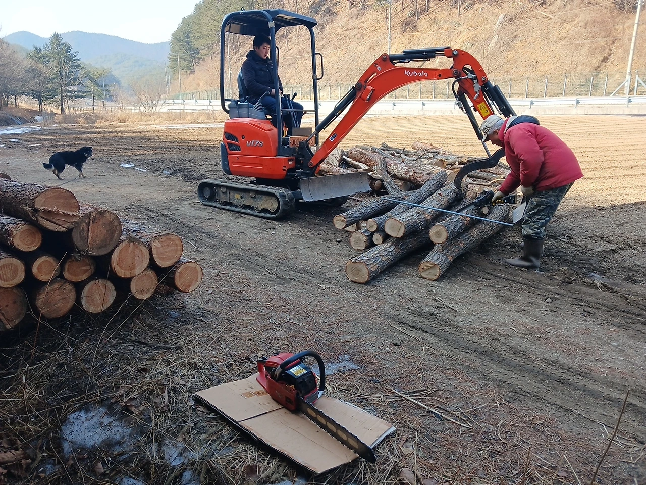 크기로 여러 개 더 포클레인과 기계톱 이용/트럭 실어