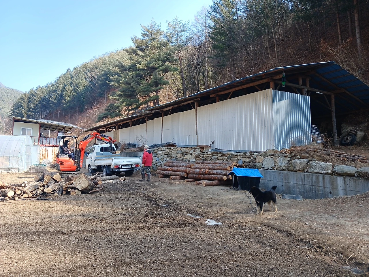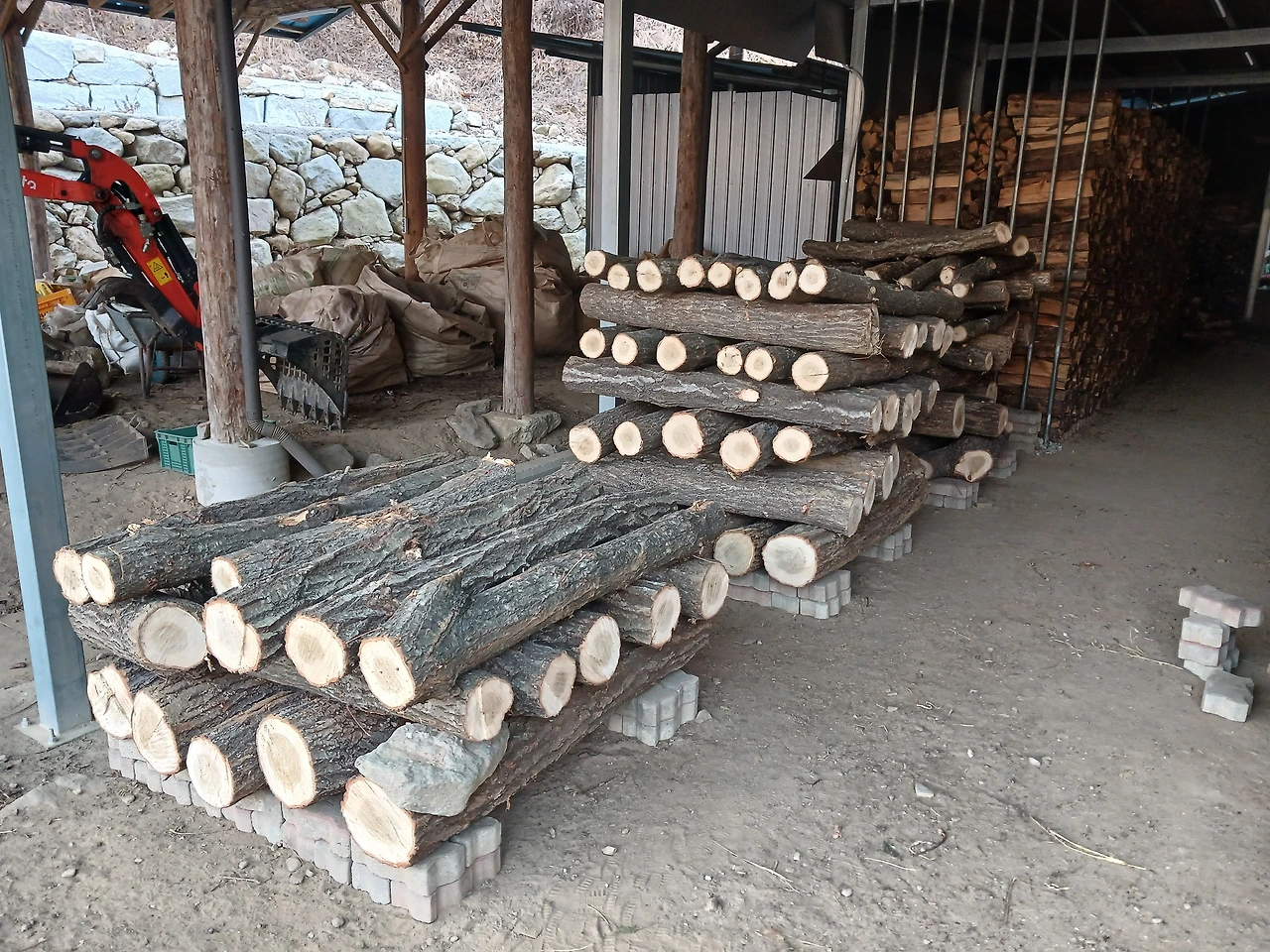 /비가림시설 내부에 우물정으로 '표고목'을 더 쌓았다.