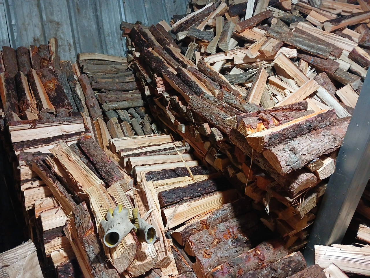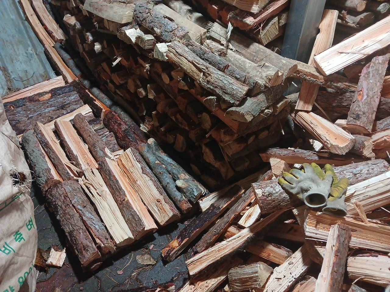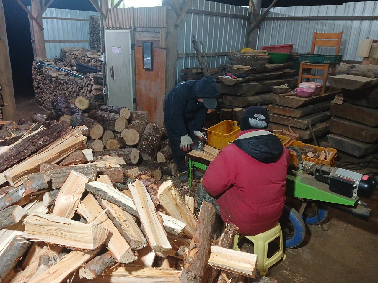 산에서 나무해와 길이 맞추어 자르고 쪼개