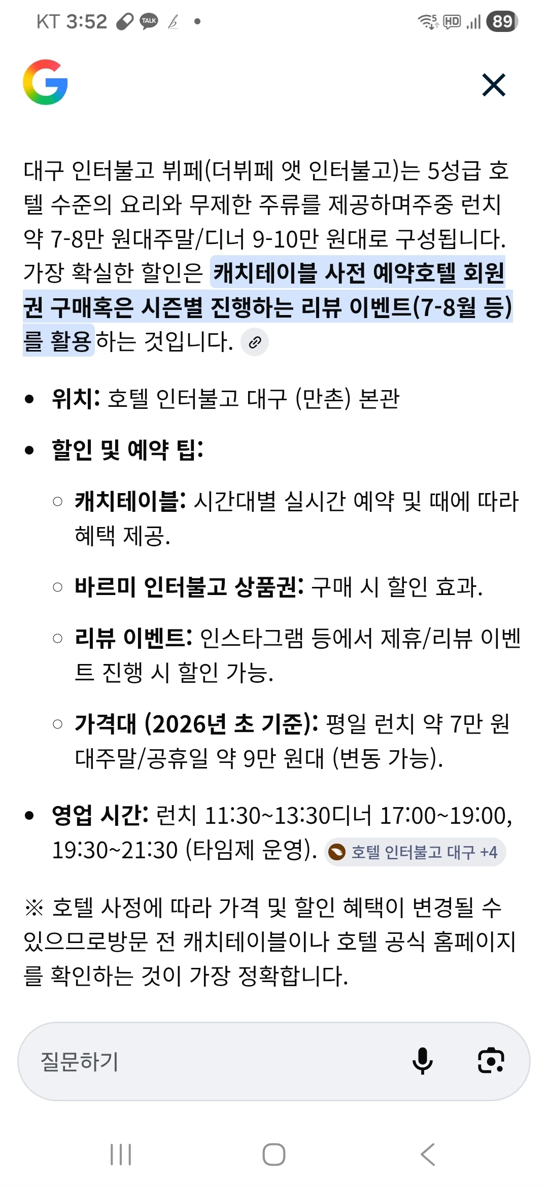내일 동생이 대구 인터불고 호텔 점심뷔페 3인 예약해 두었다.