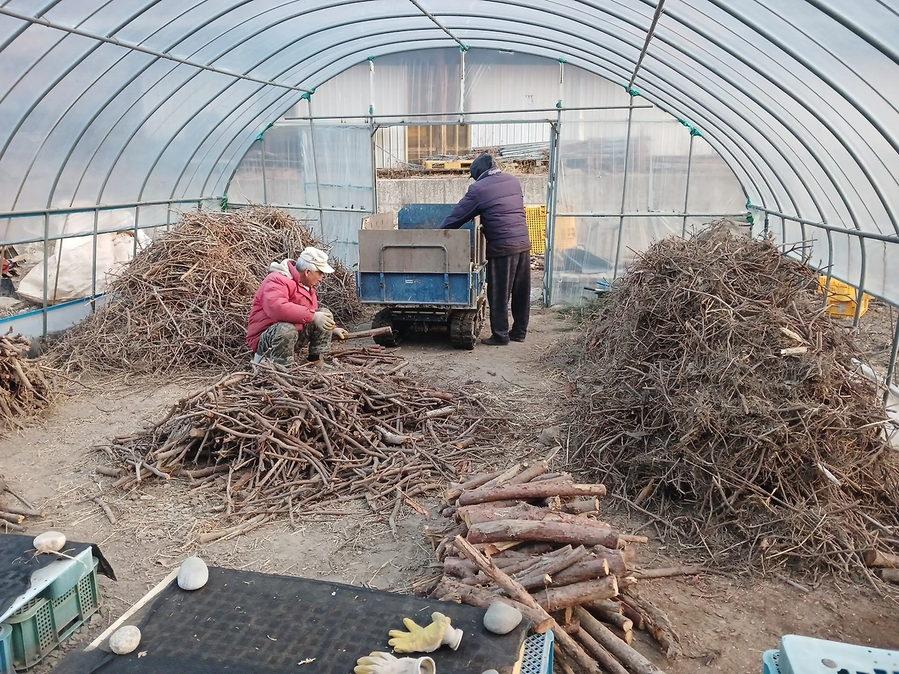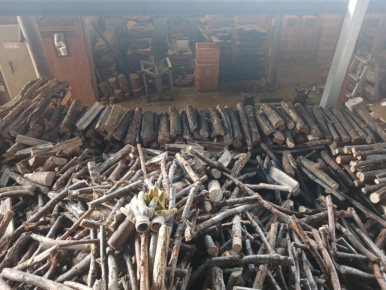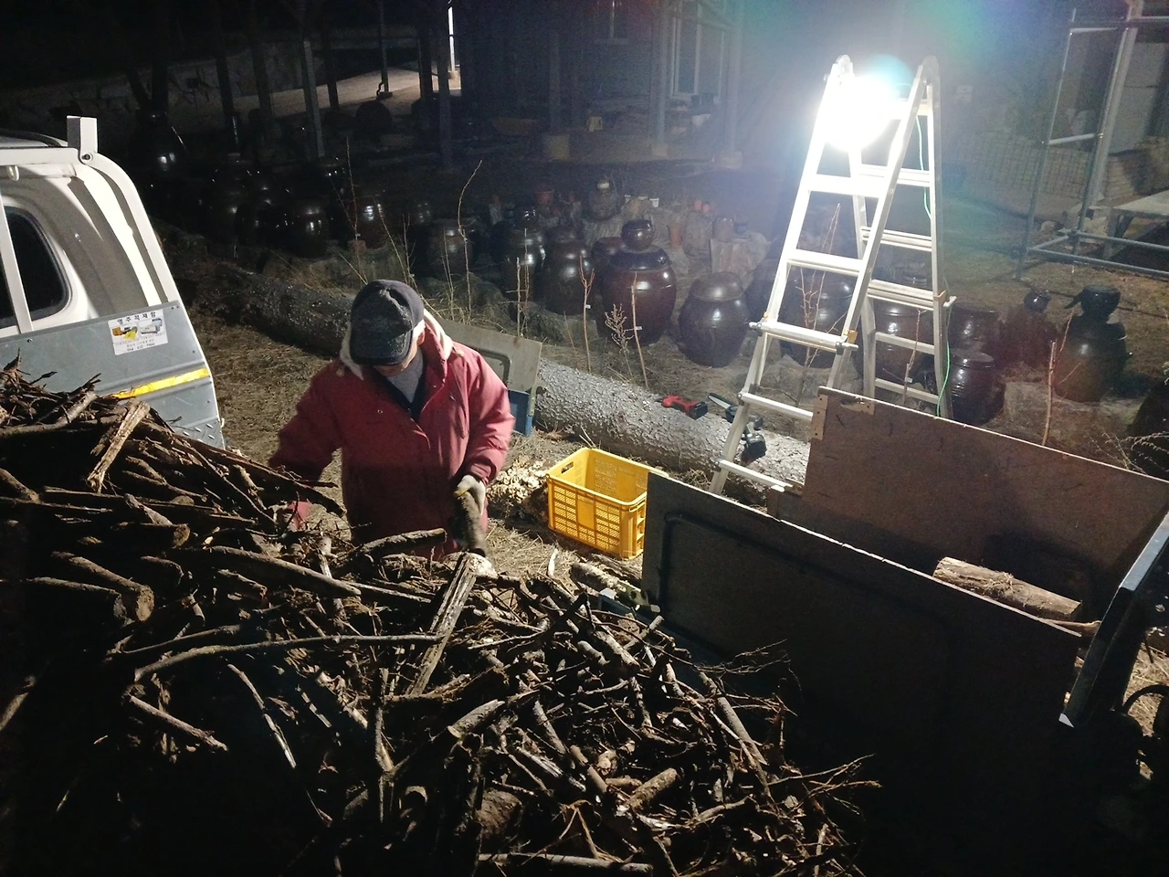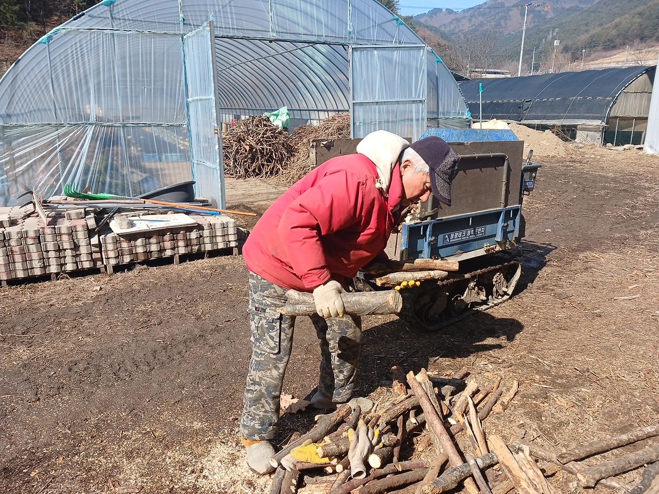 눈대중 길이로 기계톱 땔감 썰다 기준나무 맞추어