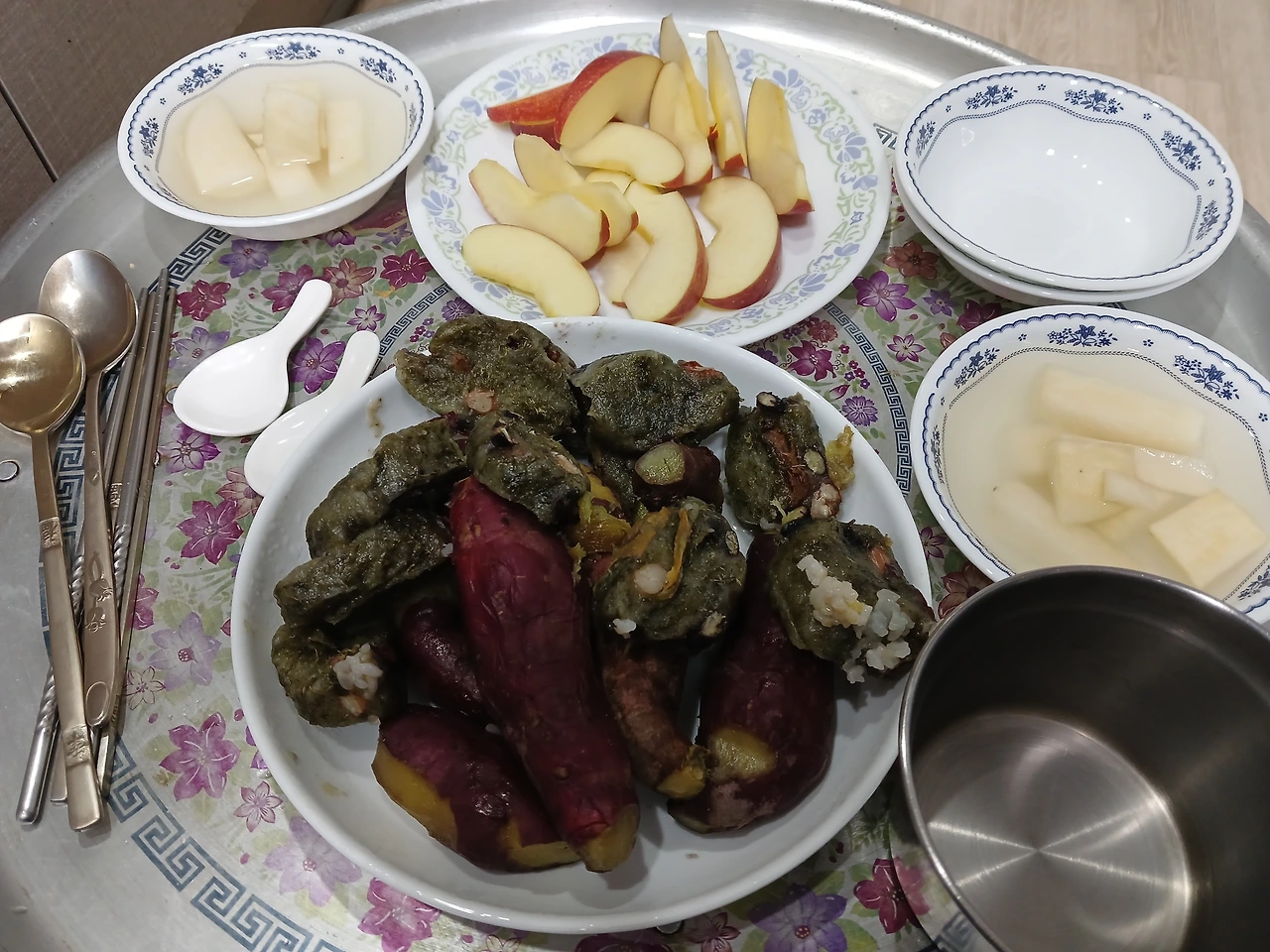 그래서 오곡찰쑥떡, 고구마, 동치미, 묵은지, 사과 참은