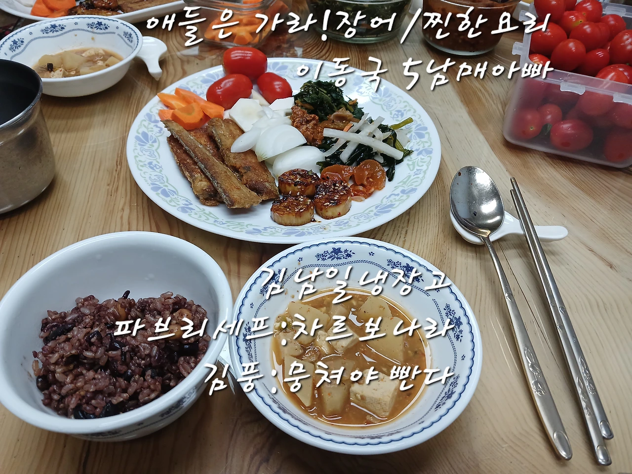 를 가장 자신 있게 하신다) 옆에 어머니는 입으로 '줄도미 2마리' 조리를 도와주신다.