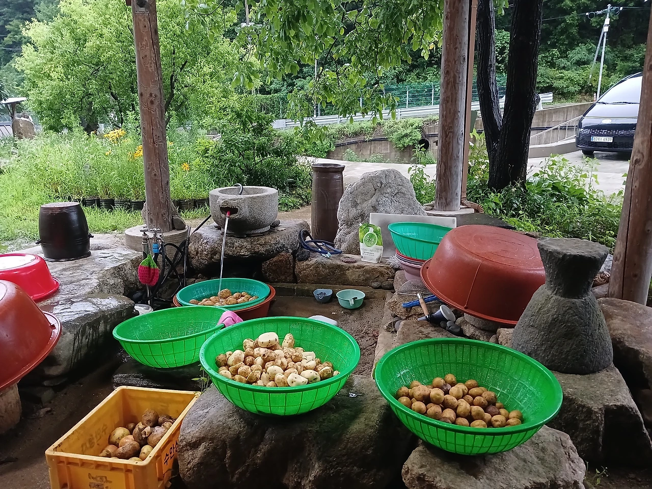 하던 감자 분류작업하러 뒤뜰로 갔다.