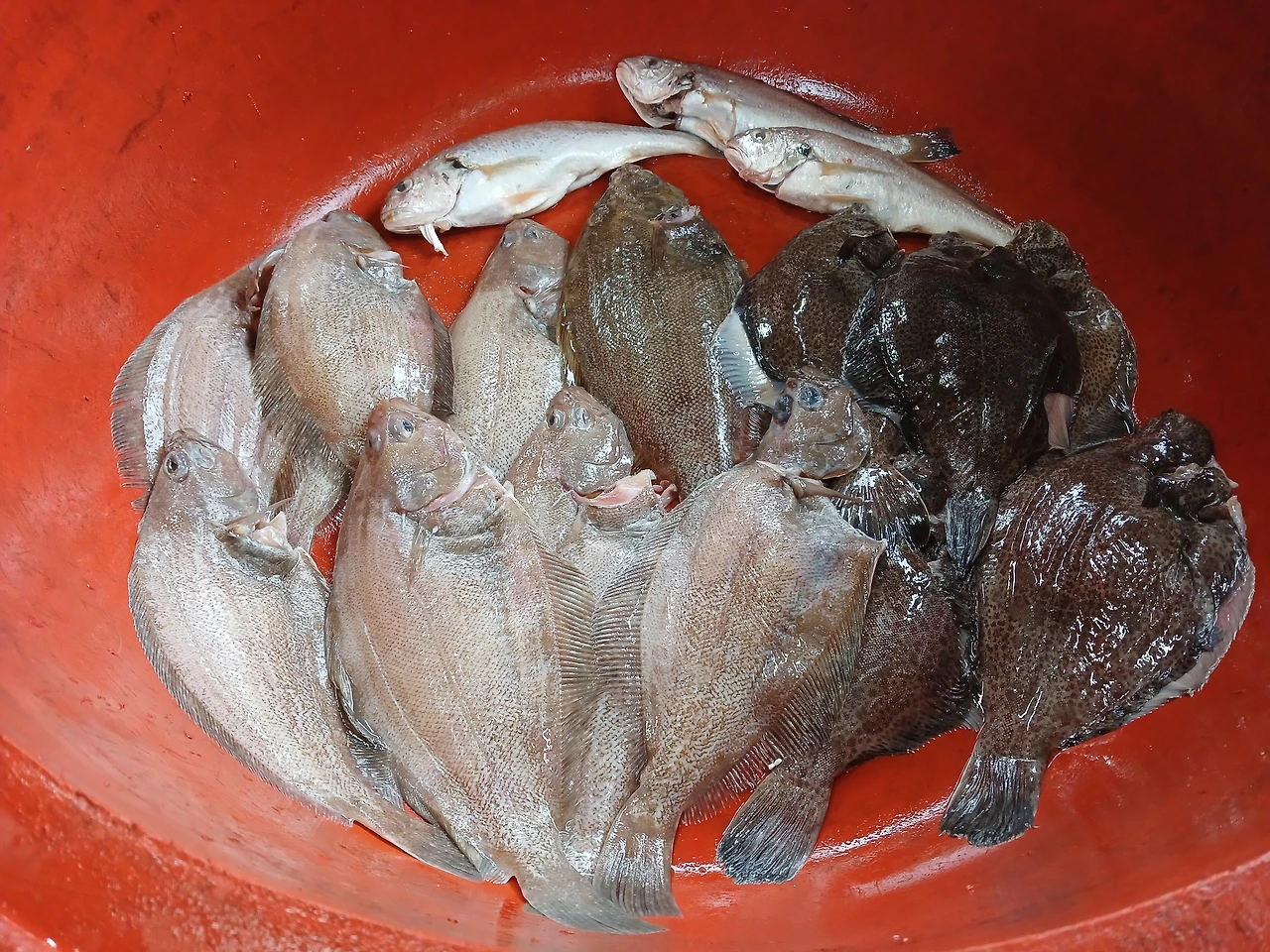 맨 위 3마리는 백조기 왼쪽 8마리는 가자미/ 오른쪽 6마리는 호박가자미이다.