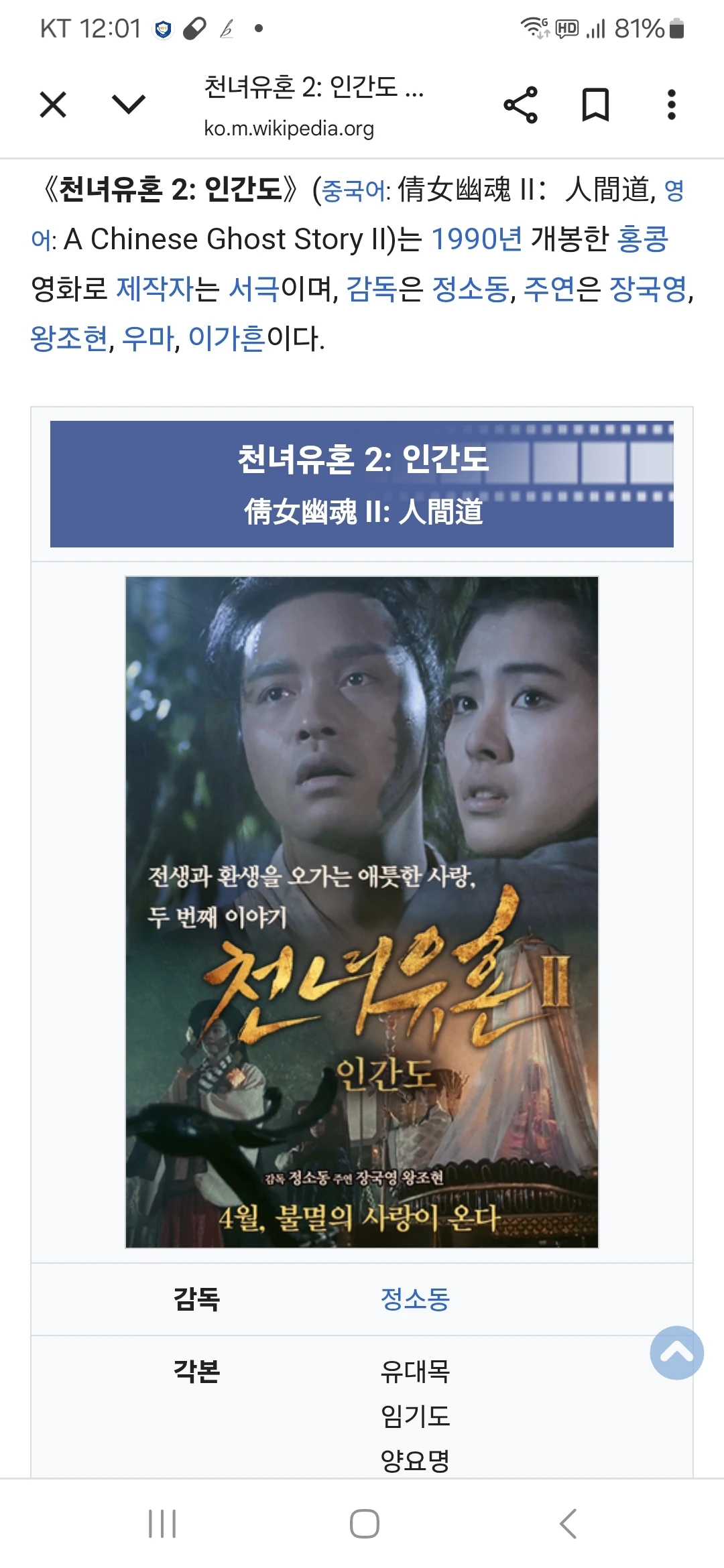 천녀유혼시리즈 들은 내가 가장 좋아했던 영화라 1부터 3까지 10번은 본 것 같다.