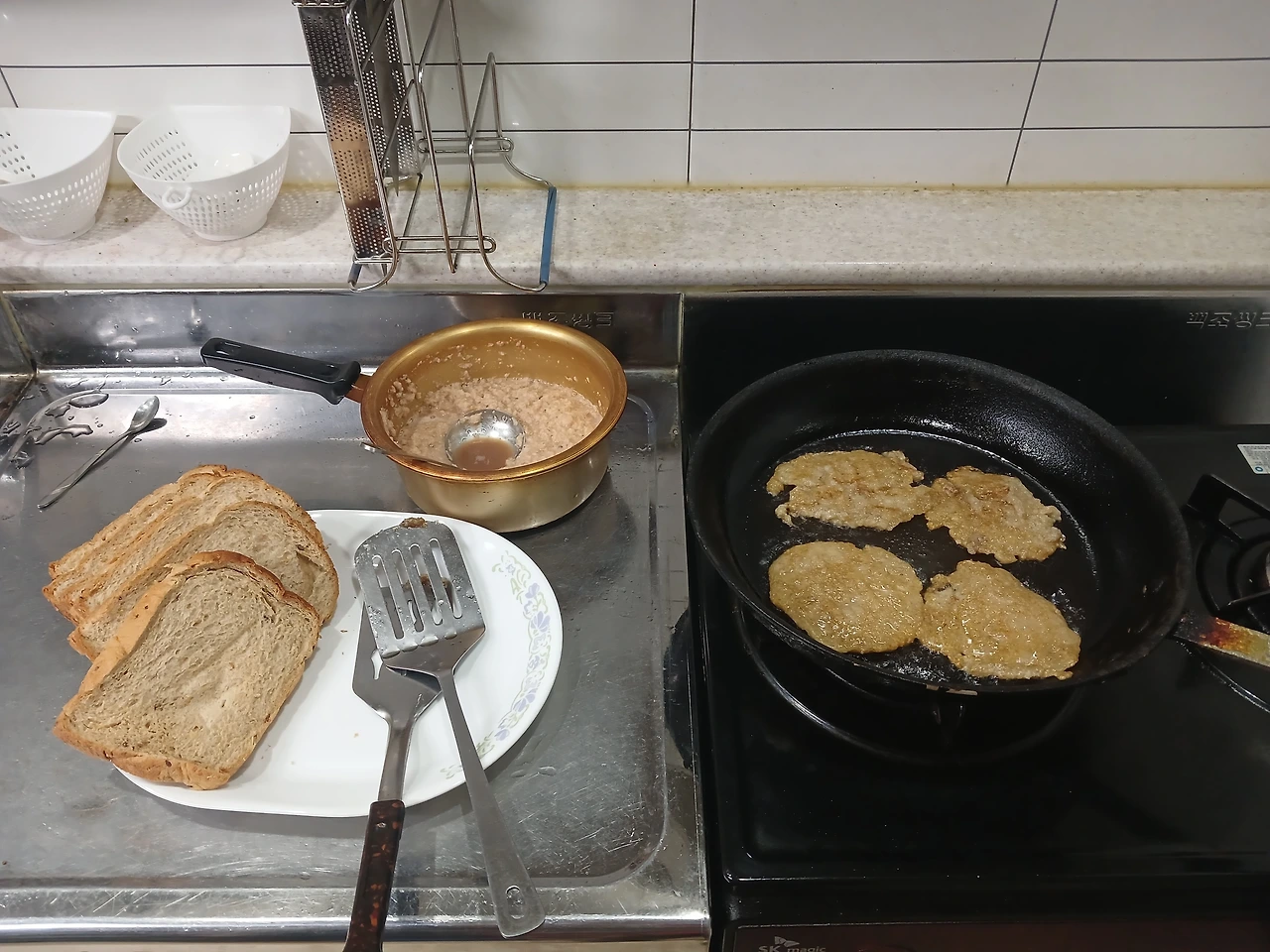 남은 잡곡식빵에 감자전 간장살짝 느타리 버섯 볶음 올려 먹는 조합도 괜찮았다.