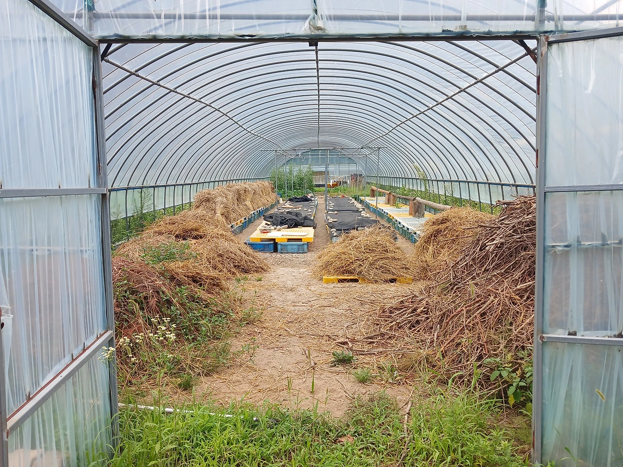 노란파레트 위 밀짚을 양옆으로 옮기고 파래트도 빼둬 동력운반차 부울 자리 만들었다.