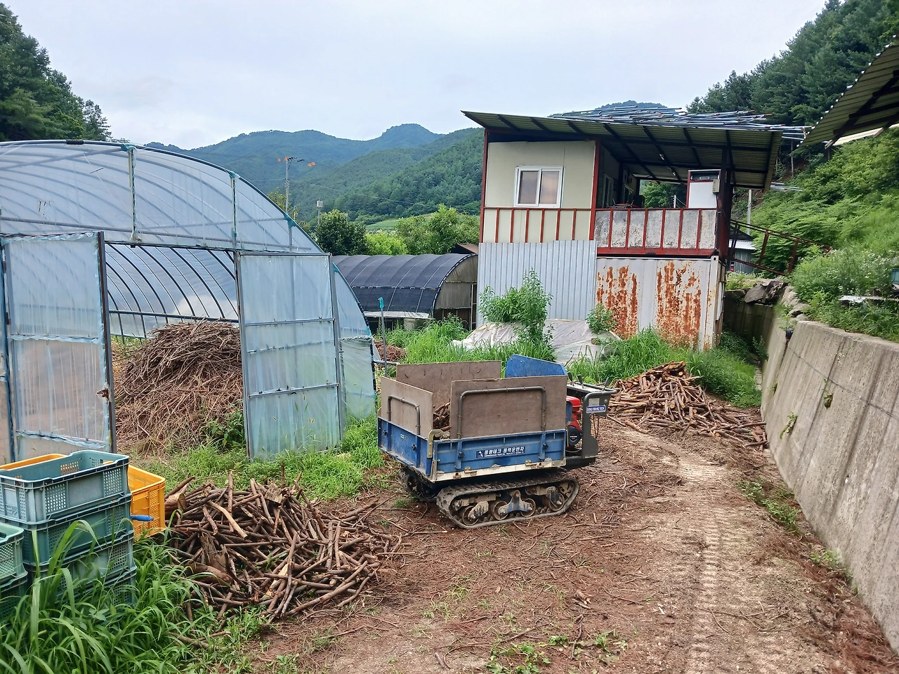 하우스 뒤편에는 아궁이 들어갈 잔가지나 중간가지를 쌓아둔다.